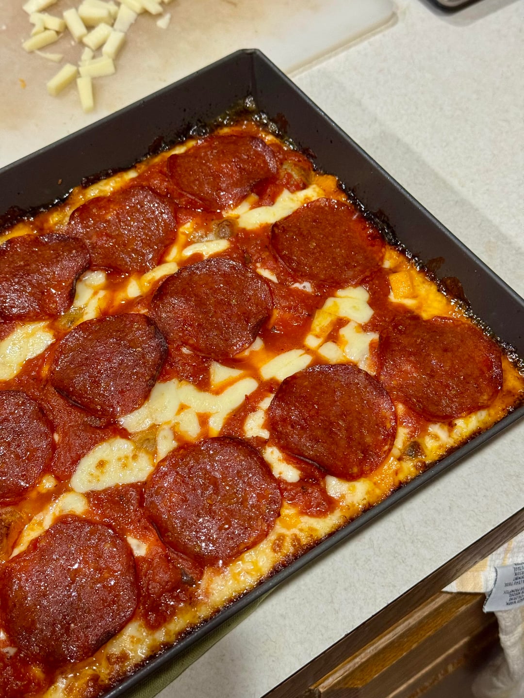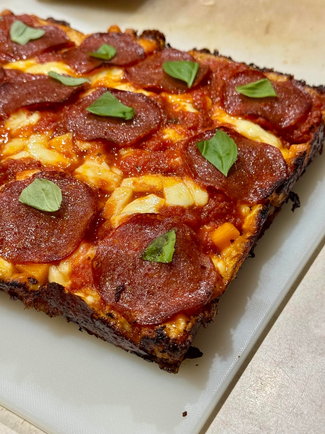 36hr fridge rise, 8hr room temp rise. 8oz brick, 5oz provolone, 3oz sharp cheddar. Extra large Columbus pepperoni. 550°F Par-baked for 5 minutes, then topped and baked for 12min. by ishook NORMAL OVENpizzaWrite A CommentYou must be logged in to post a comment.