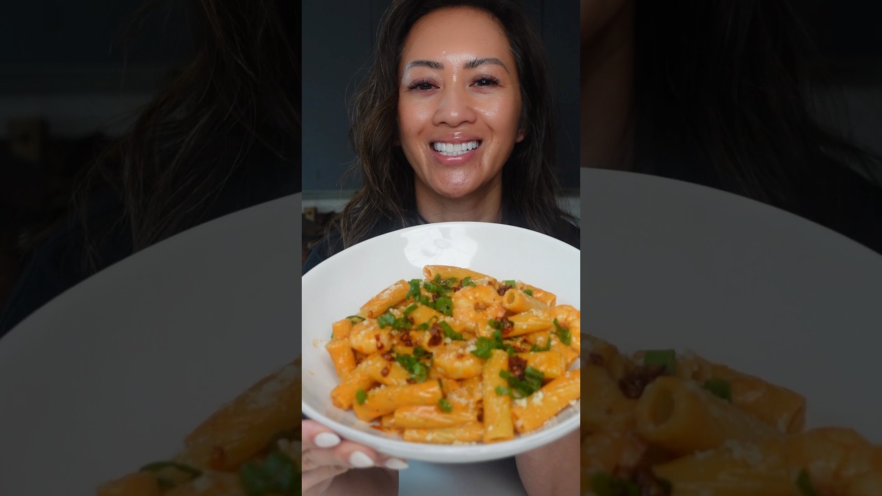 directions: 1. Cook the rotini al dente per box directions. Reserve a cup of the pasta water. 2. Heat olive oil in a skillet and cook the shrimp for 2 minutes on each side. Transfer to a place. 3. Add the shallot, white part of the green onions and garlic into the skillet. Cook for a few minutes. Add the gochujang, sugar and soy sauce. Cook for a few minutes then add the heavy cream and 1/4 cup of the pasta water. Stir and let sauce thickened for a few minutes. Then add the butter. Stir until butter has melted. Check for seasoning. 4. Return the shrimp to the pan along with the pasta and toss to combine. 5. Serve with parmesan, sliced green onion and chili oil. Enjoy ❤️