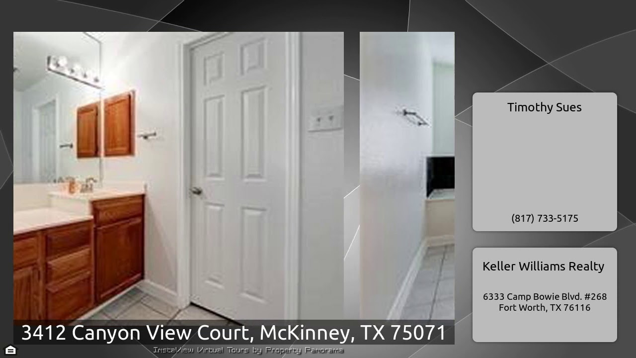 The Virtual Tour for the property at 3412 Canyon View Court, McKinney, TX 75071 listed for $1,775: Other homes for sale by Timothy Sues of Keller Williams Realty: Adorable immaculate home nestled on a quarter acre of land in great location! Great curb appeal with mature landscaping. Tons of upgrades including wood floors in entry, 2nd living area, dining and both secondary bedrooms. Open floor plan with cozy fireplace. Beautiful tile flooring from Italy, new carpet, SS appliances with brand new gas cooktop (2018). Super energy efficient upgrades including added insulation, tankless water …