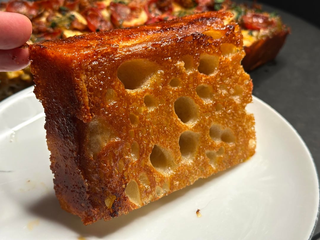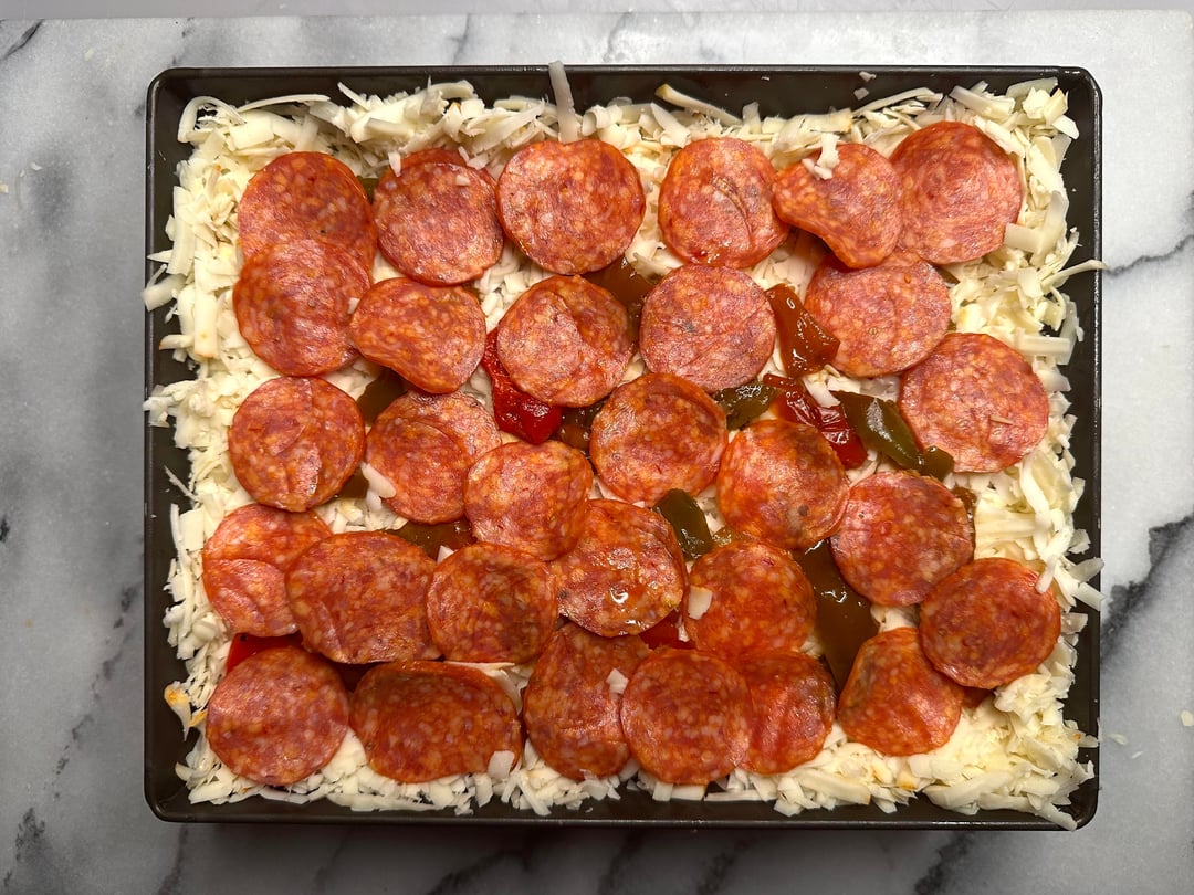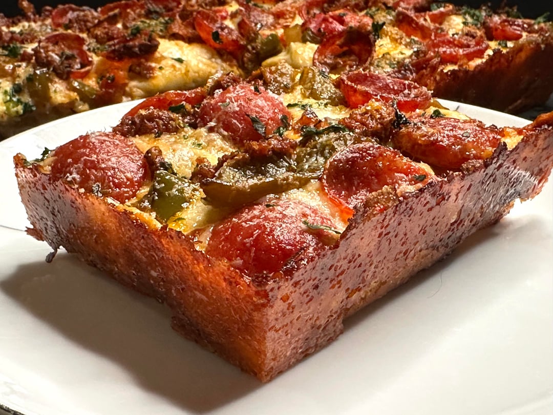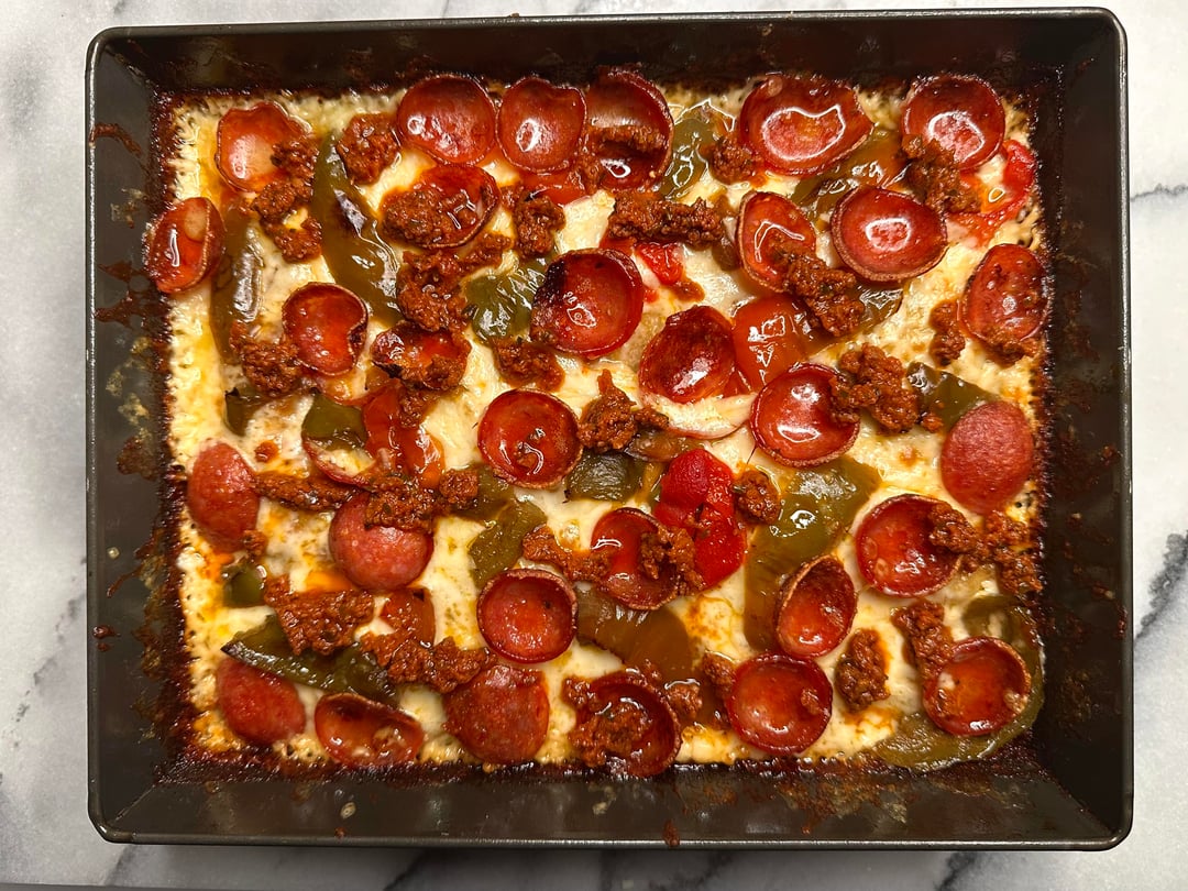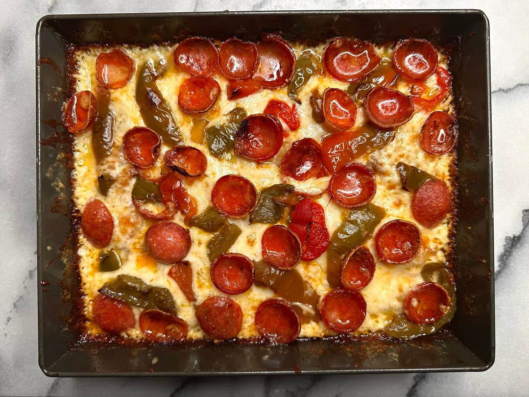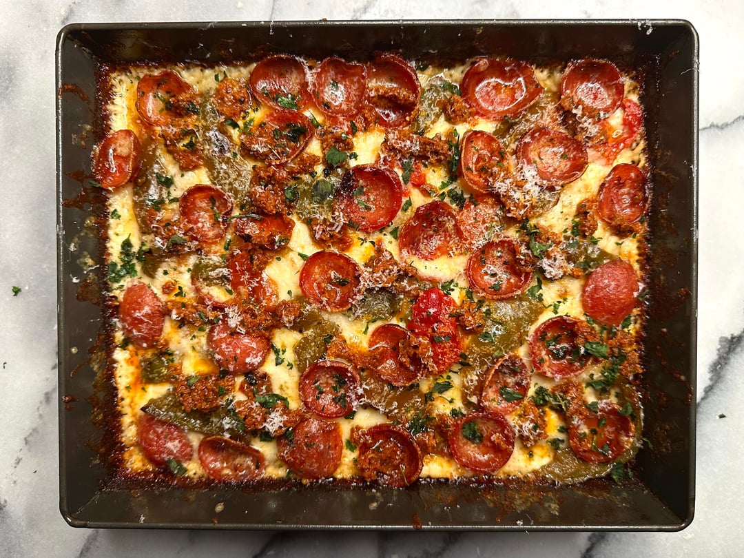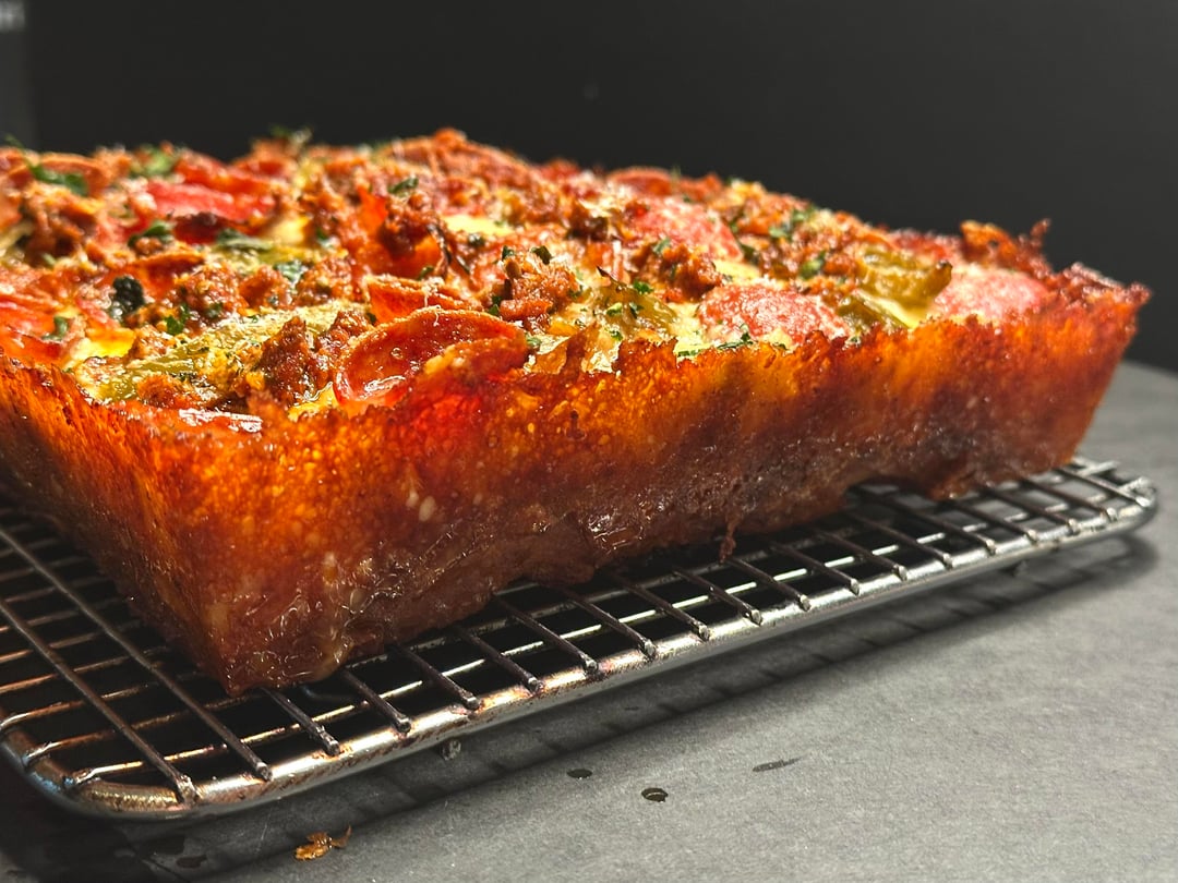 Pizza night! This week’s special was another Detroit-style (on a par baked base) with Muenster and sharp cheddar mix. Topped with cupping pepperoni, and pan-fried bell peppers. Out of the oven I added some red pesto, dried herbs, and freshly grated Cotija cheese.