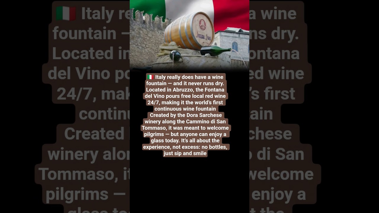 🍷🇮🇹 Italy really does have a wine fountain — and it never runs dry. Located in Abruzzo, the Fontana del Vino pours free local red wine 24/7, making it the world’s first continuous wine fountain 😮✨.