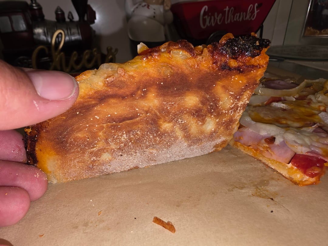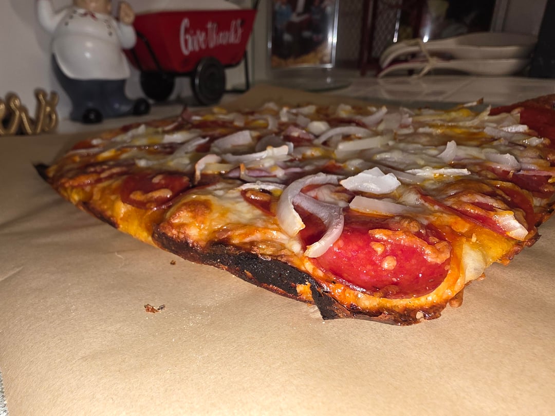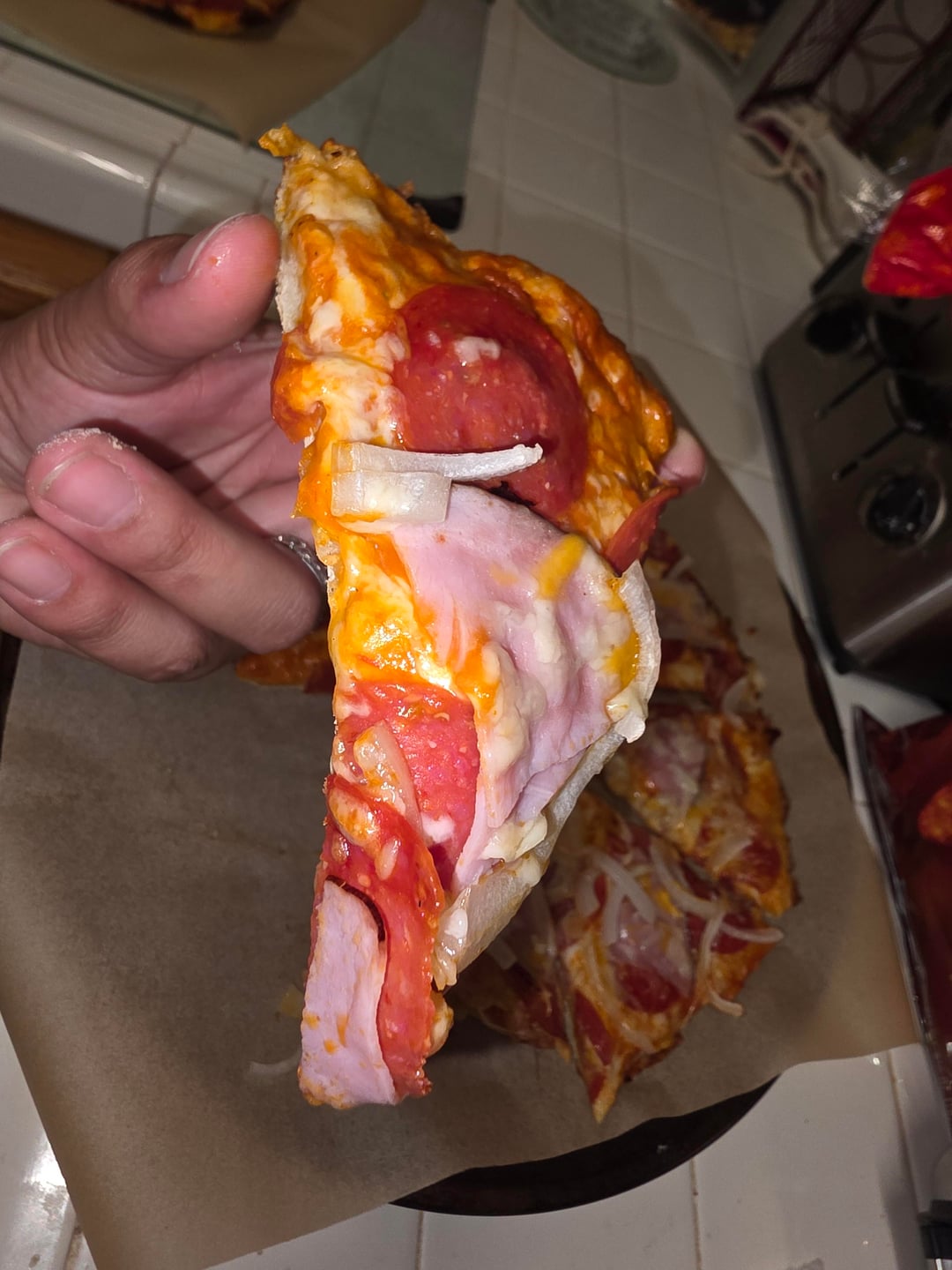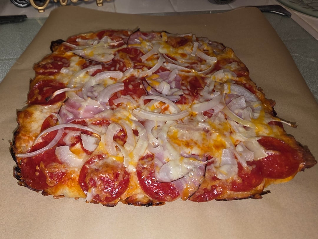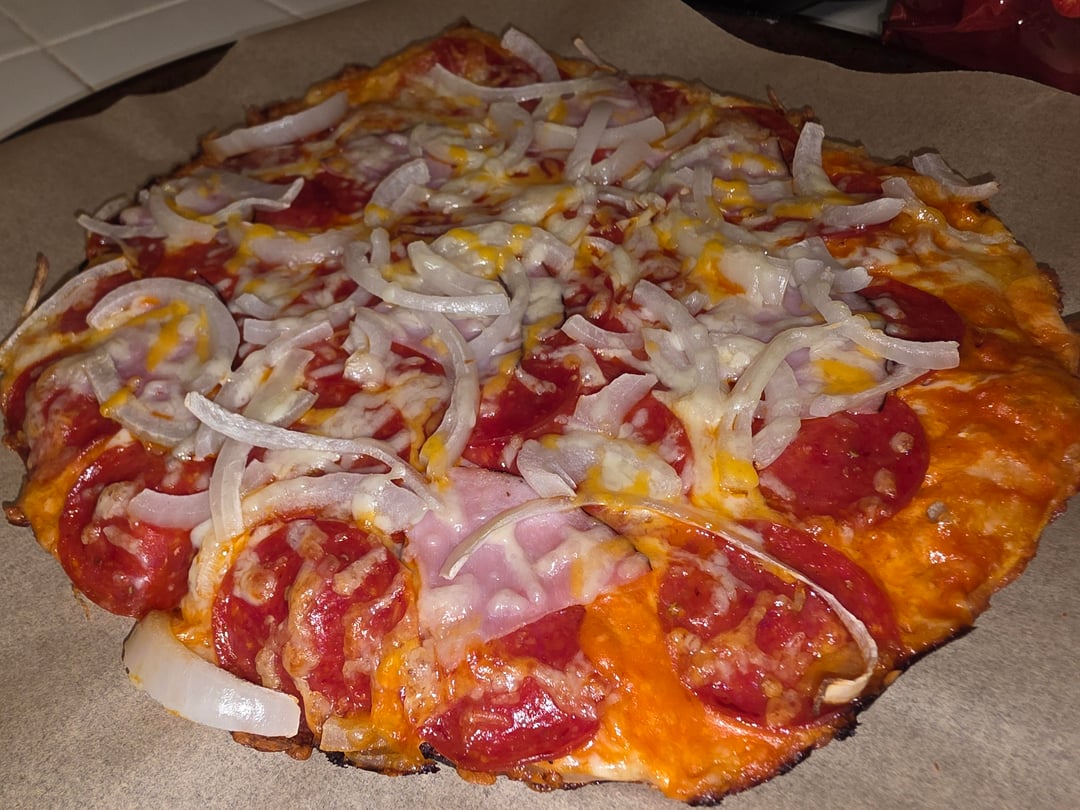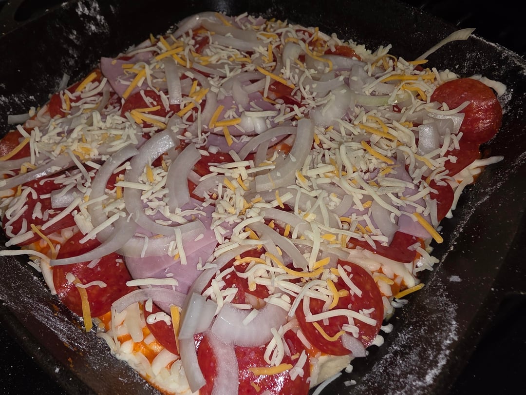 Store bought pizza dough with vodka sauce, mozzarella cheese, pepperoni, black forest ham, sweet onions, and Mexican blend cheese.