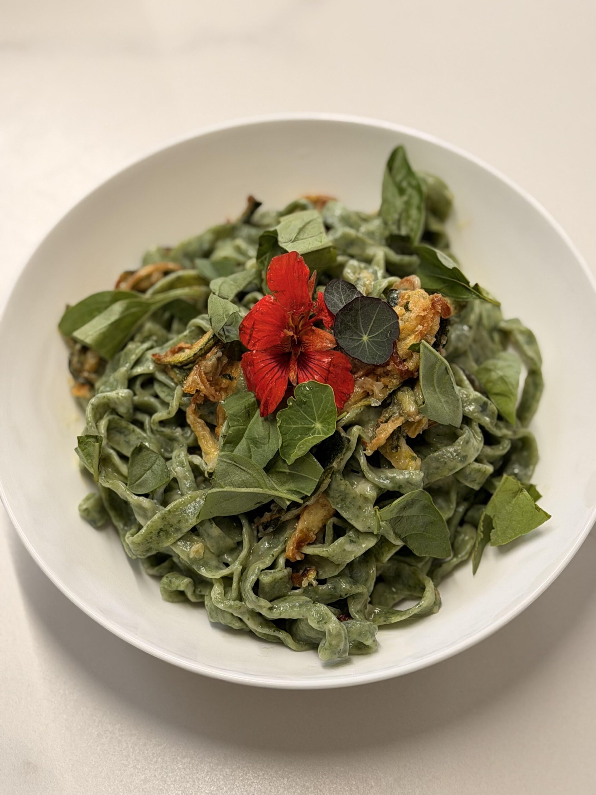 Sauce is recipe from Marcella Hazan’s classic, but basically is deep fried (home grown) zucchini mixed through with melted butter, garlic, basil and grated parm.