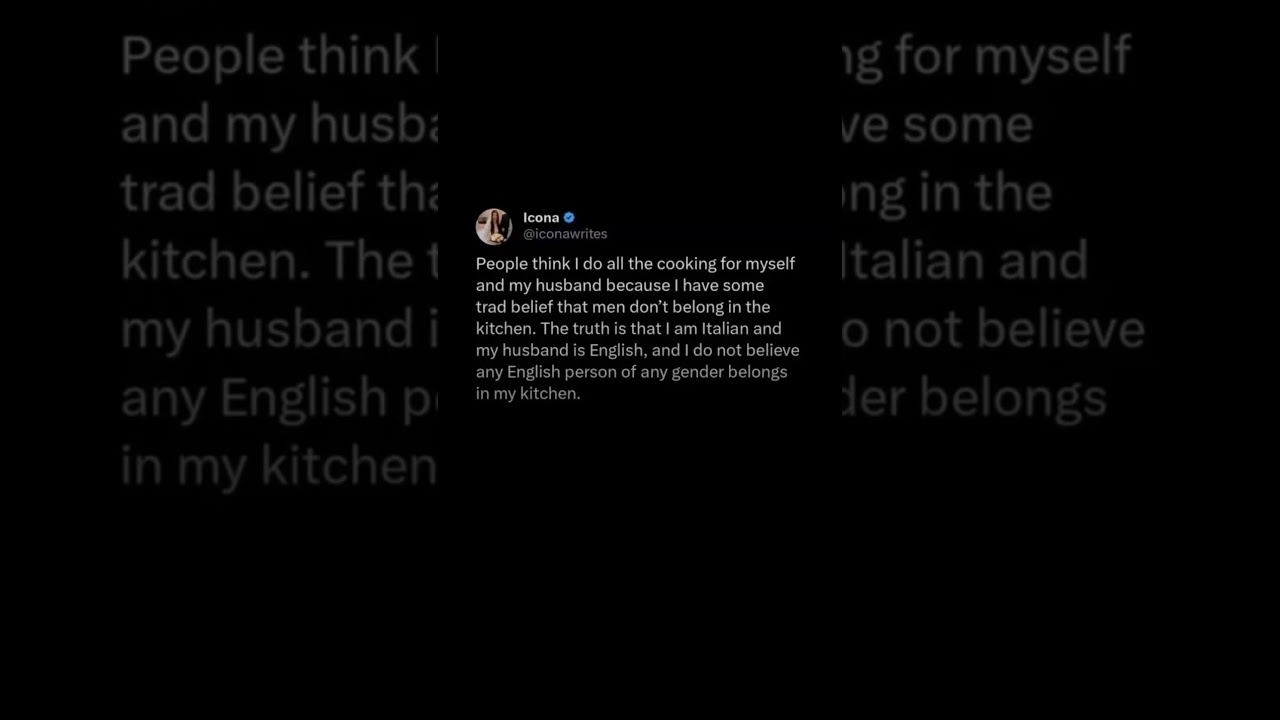A screenshot of a humorous tweet where a woman clarifies that she does all the cooking not because of traditional gender roles, but because she’s Italian and her husband is English. With sharp wit, she jokes that it’s not about men being unwelcome in the kitchen—it’s that no English person of any gender is allowed near her cooking space. The post playfully blends cultural stereotypes with self-aware humor and relationship dynamics.