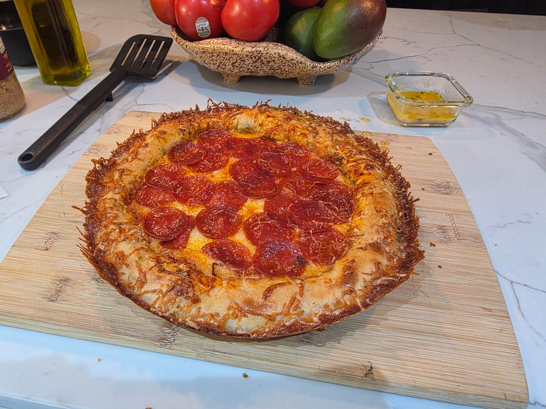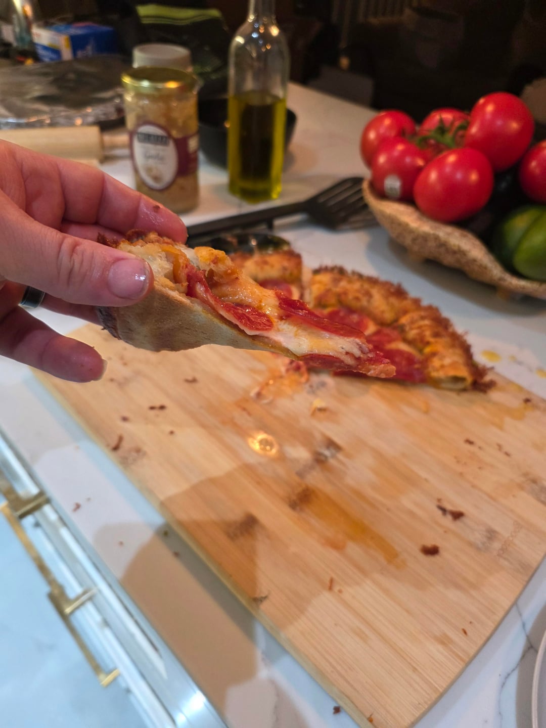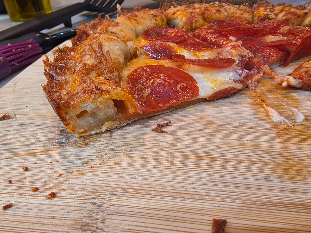 I posted for the first time here earlier today. Needless to say I understand now. I made a second pizza with some left over ingredients. Tomato sauce base, Béchamel sauce stripes under cheese, pepperoni, parm reg, cheese skirt and garlic butter. Here is the pizza, a side view, the stuffed crust, the undercarriage and zero flop! Second attempt at stuffed crust!