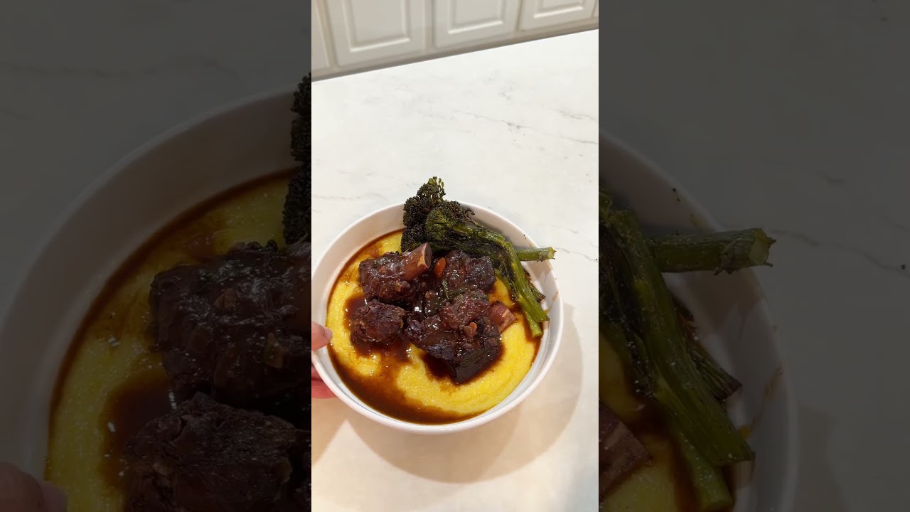 Serve short ribs over polenta, adding extra sauce. Serve with a veggie (I did roasted broccolini) and enjoy! #dinner #recipe #braised #shortribs #polenta
