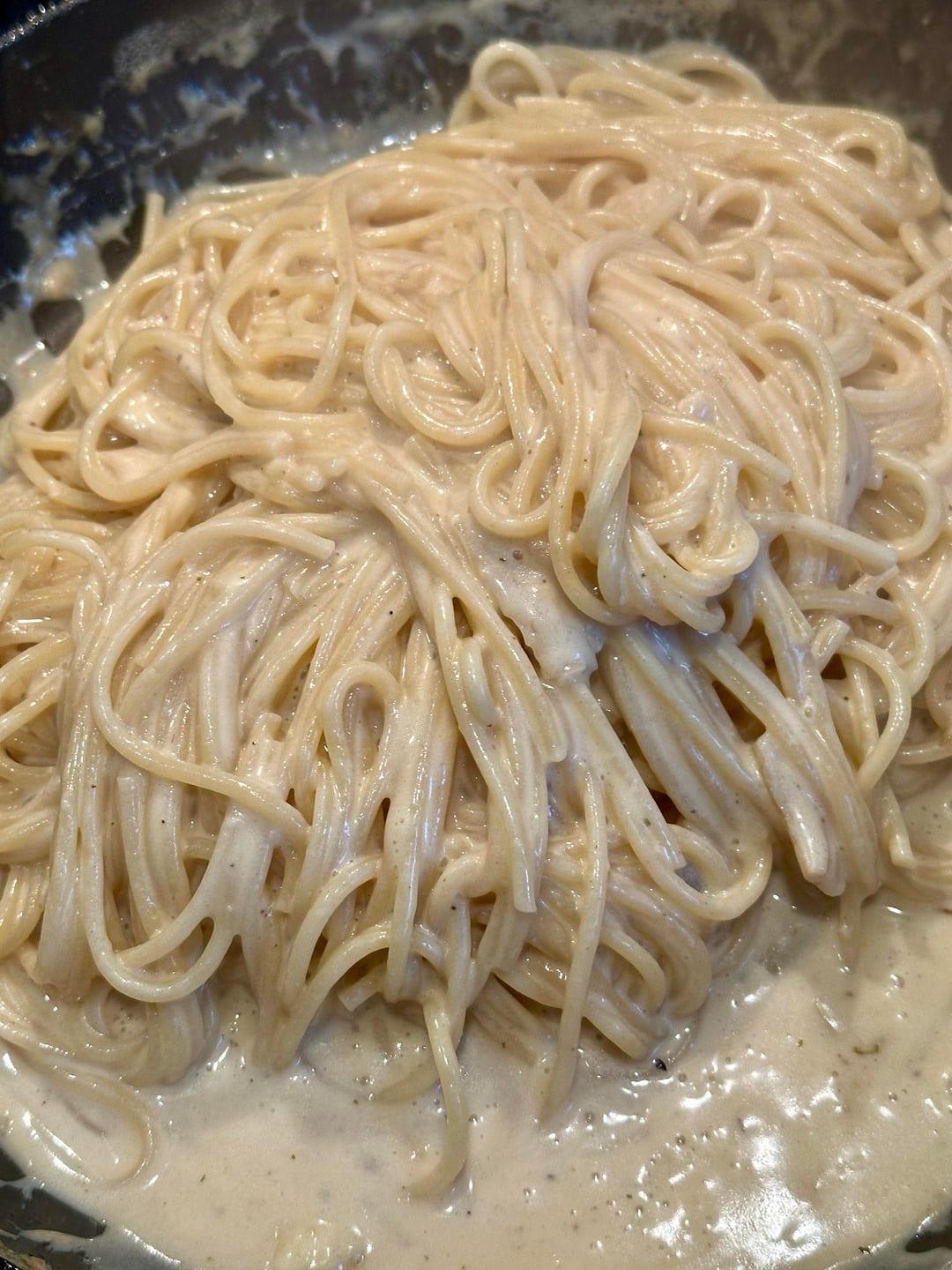 Add your favorite Al dente pasta to cream sauce and serve with chicken.