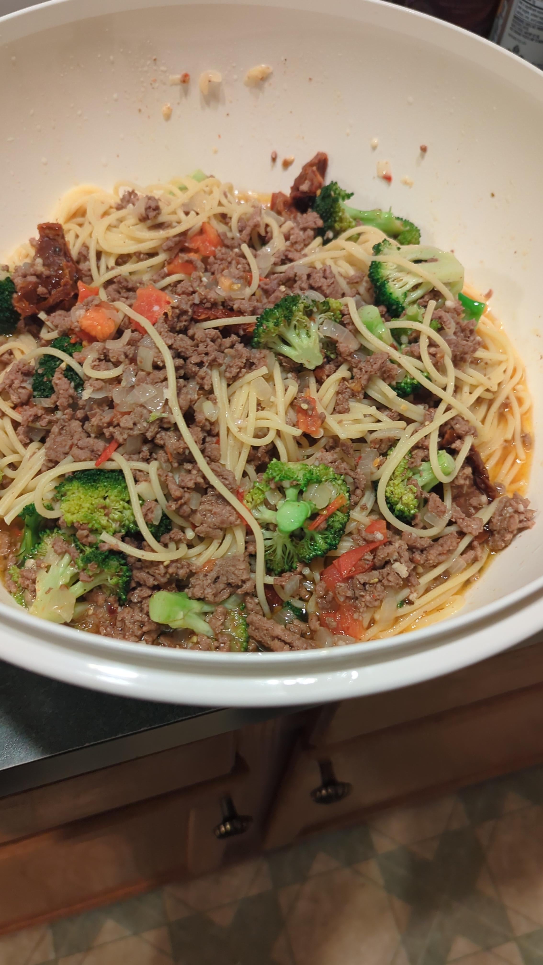 Many years ago what started out as a simple garlic & sauteed onions over Pasta after a late night has grown into the delicious dish before you. Broccoli and ground beef have been added along with chopped tomatoes. Variations include half ground beef half ground sausage or substituting chopped sun dried tomatoes instead of chopped tomatoes You can also forgo the meats entirely for a healthier option ie religious holidays…. In any case, go heavy on the garlic and top with lots of cracked pepper and cheese. Personally, a heavy dose of crushed red peppers go in to bring a fiery heat to the garlicky oil that coats the pasta. Enjoy!!!