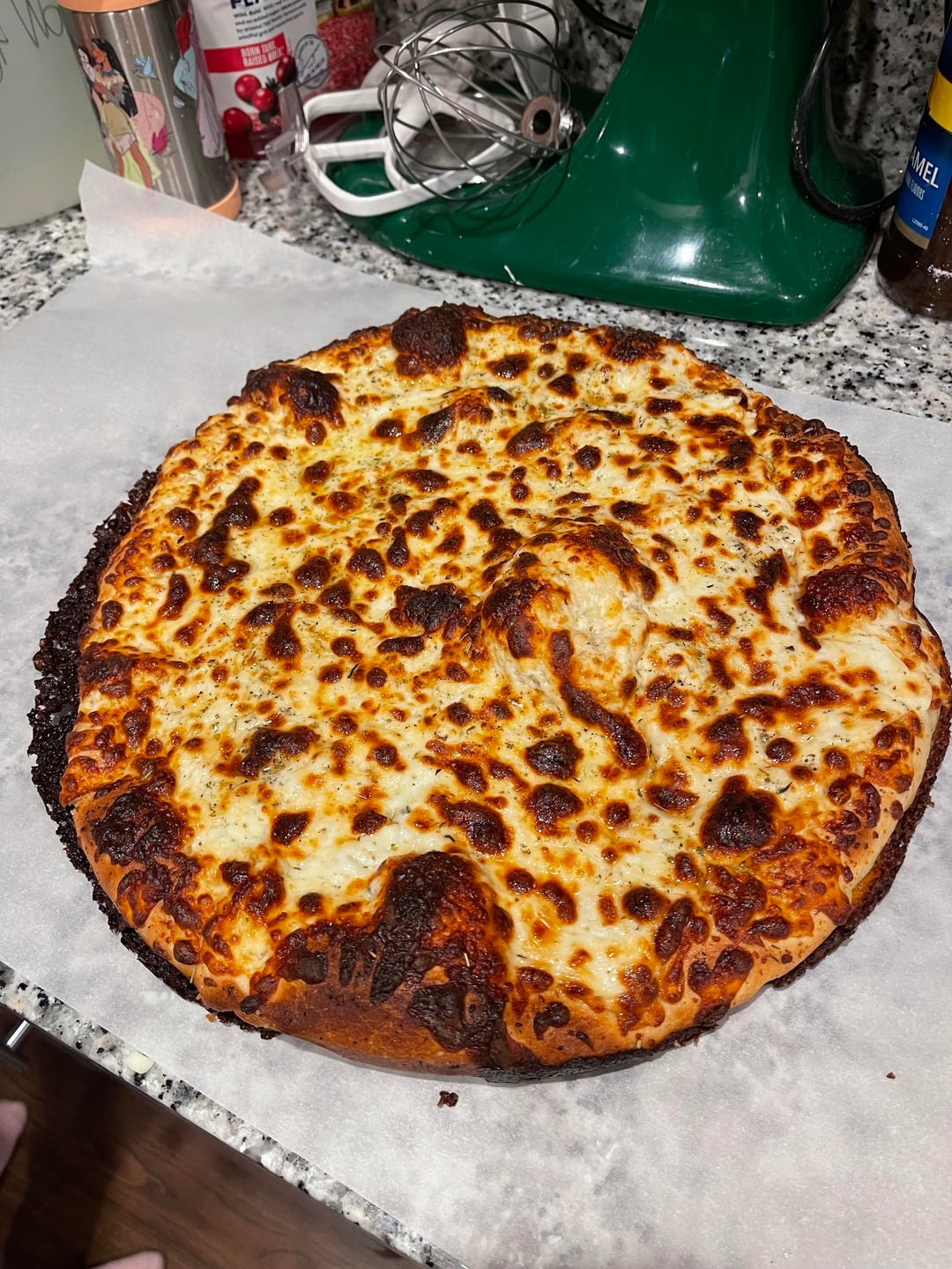 I made a simple cheese pizza this week. I pressed out the dough and laid it in a pizza pan coated in olive oil. Made sure the dough was coated on top and bottom in the olive oil and let it sit out on my counter for about half an hour after I covered it in mozzarella cheese and then dusted it with Italian seasoning, a little garlic salt and sugar mixture and baked in my preheated oven at 550°F for 12 min. Turned out great! The olive oil really made the undercarriage crispy and flavorful.