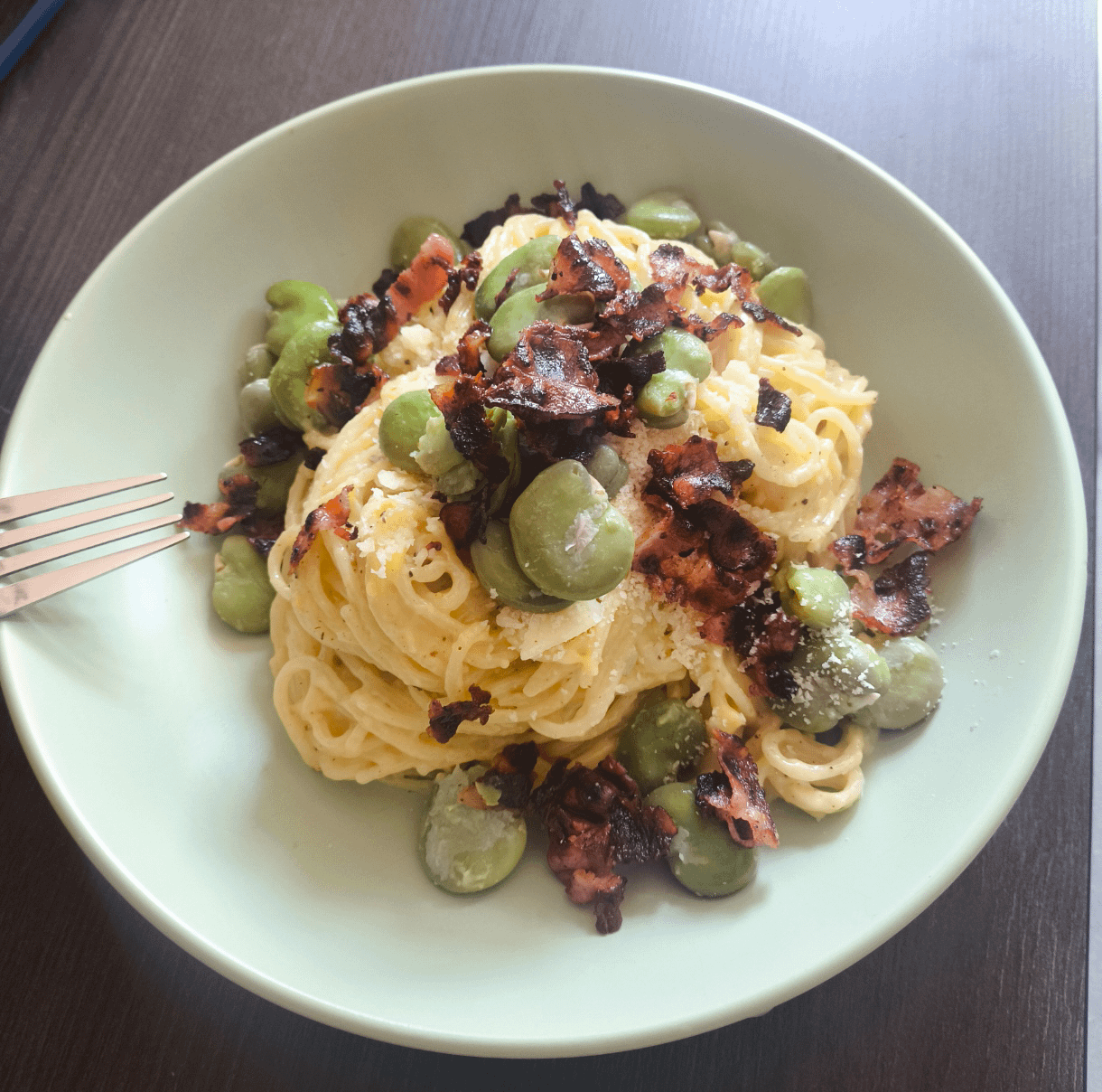 A variation on Alfredo. Pasta in a velvety butter and Parmesan sauce with broad beans and crispy bacon.by rottbone PastaWrite A CommentYou must be logged in to post a comment.