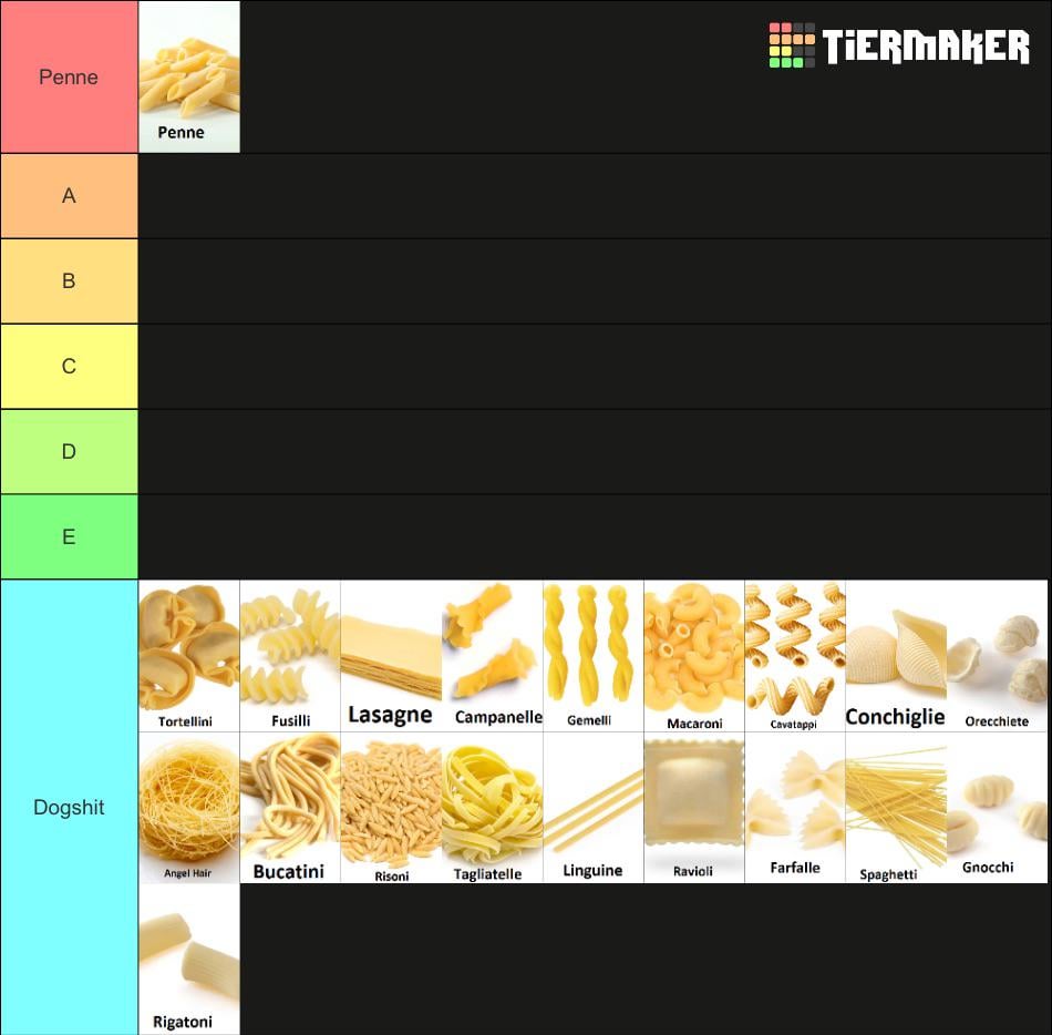 What do you think ? Any changes I should make ?by Saekama Pasta 5 Comments Green-Draw8688 2 days ago Macaroni is too high Physical-Flatworm452 2 days ago Pasta is life, pasta is love. A-flat_Ketone 2 days ago Spaghetti is way too high. Rigatoni is basically penne except better for ground meat pastas lol. e-card 2 days ago I only agree with Farfalle. LPenne 2 days ago LolWrite A CommentYou must be logged in to post a comment.
