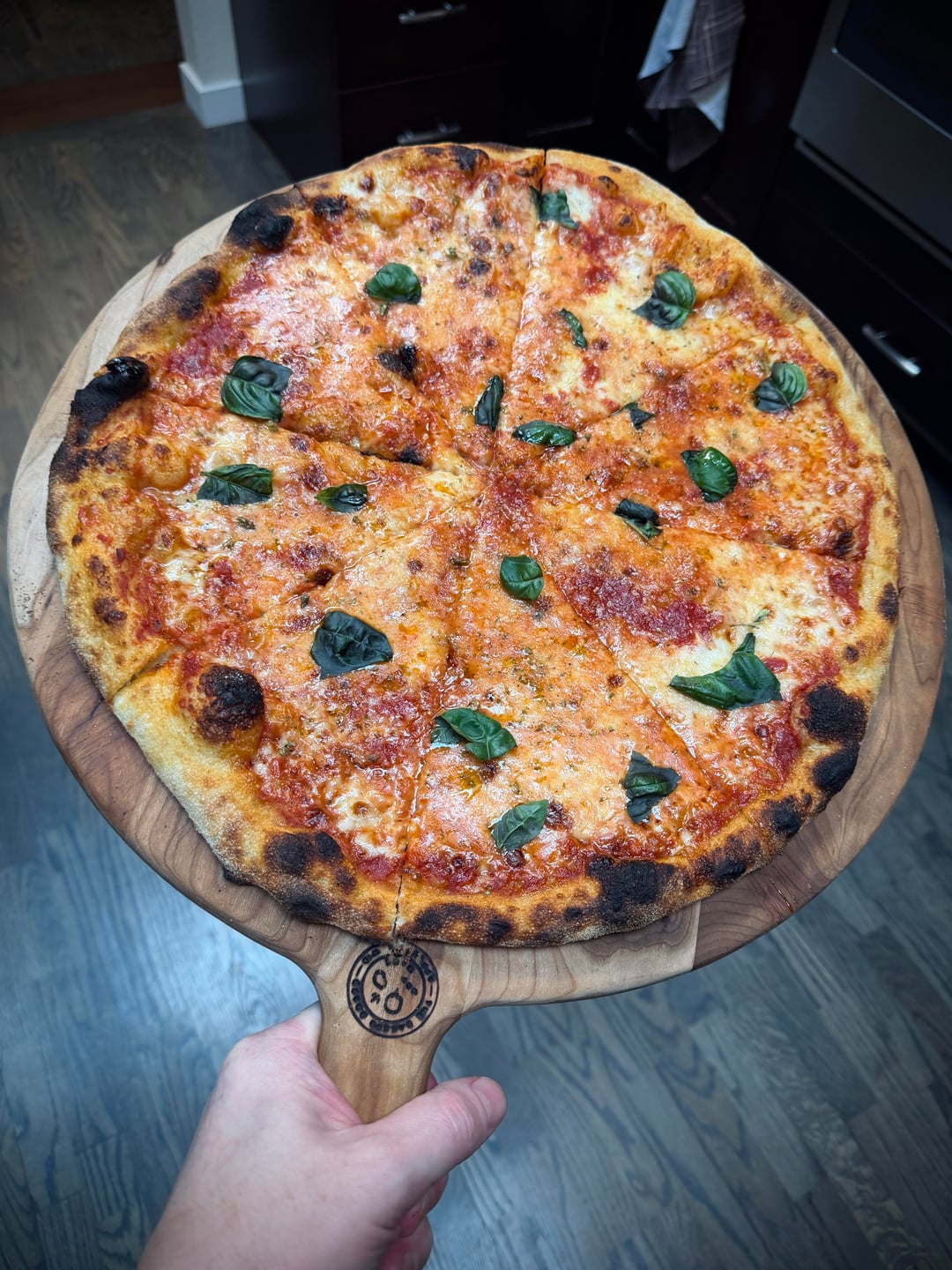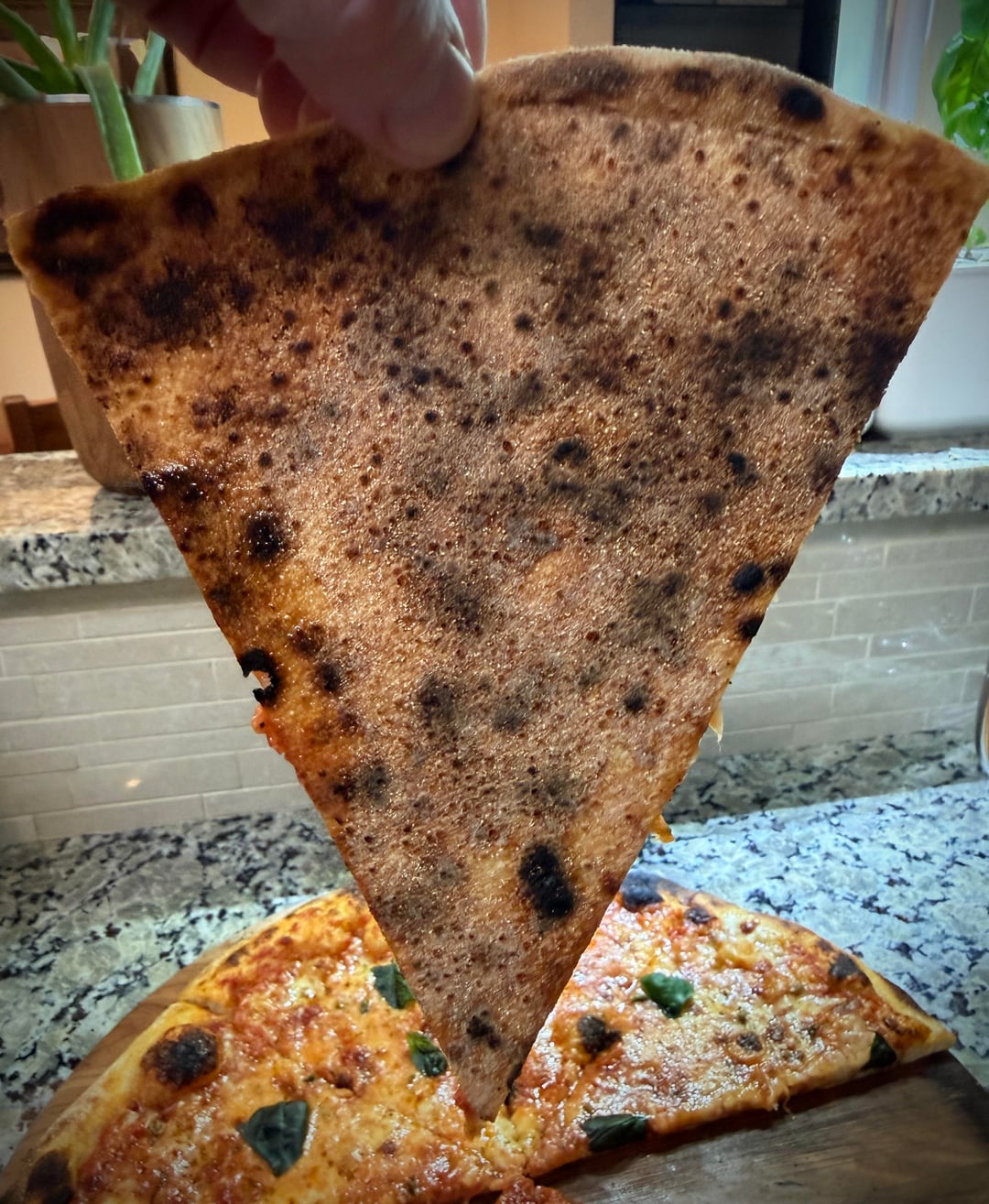 75/25 Blend of King Arthur Sir Lancelot and Caputo Nuvola Super flour at 62% hydration, cold fermented for four days. 3% salt. 2% olive oil. 1% malt.