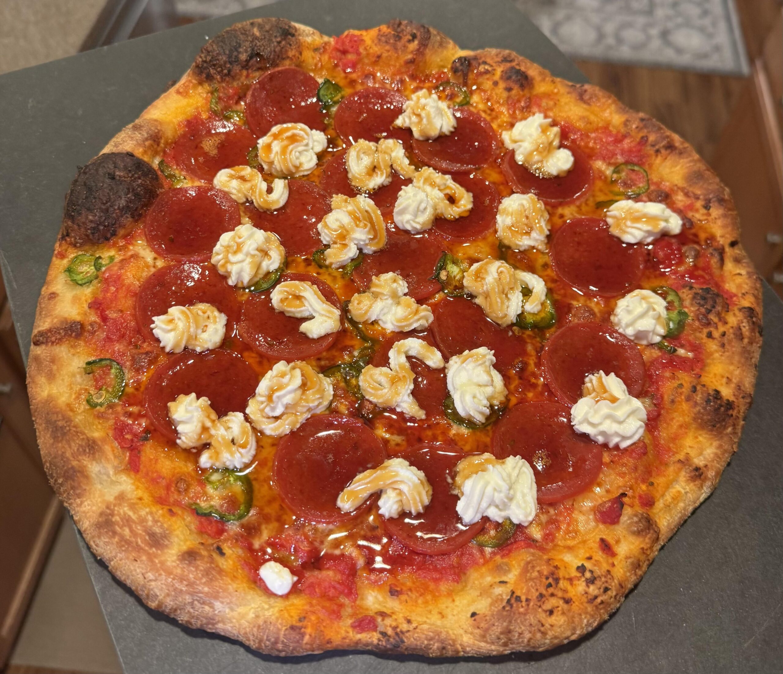 Here’s my first crack at a Pepperoni and Jalapeno pizza with ricotta and hot honey. I also mixed calabrian chili jam with my sauce to amp up the spice. Went pretty heavy on the honey, so I’ll dial that back next time!