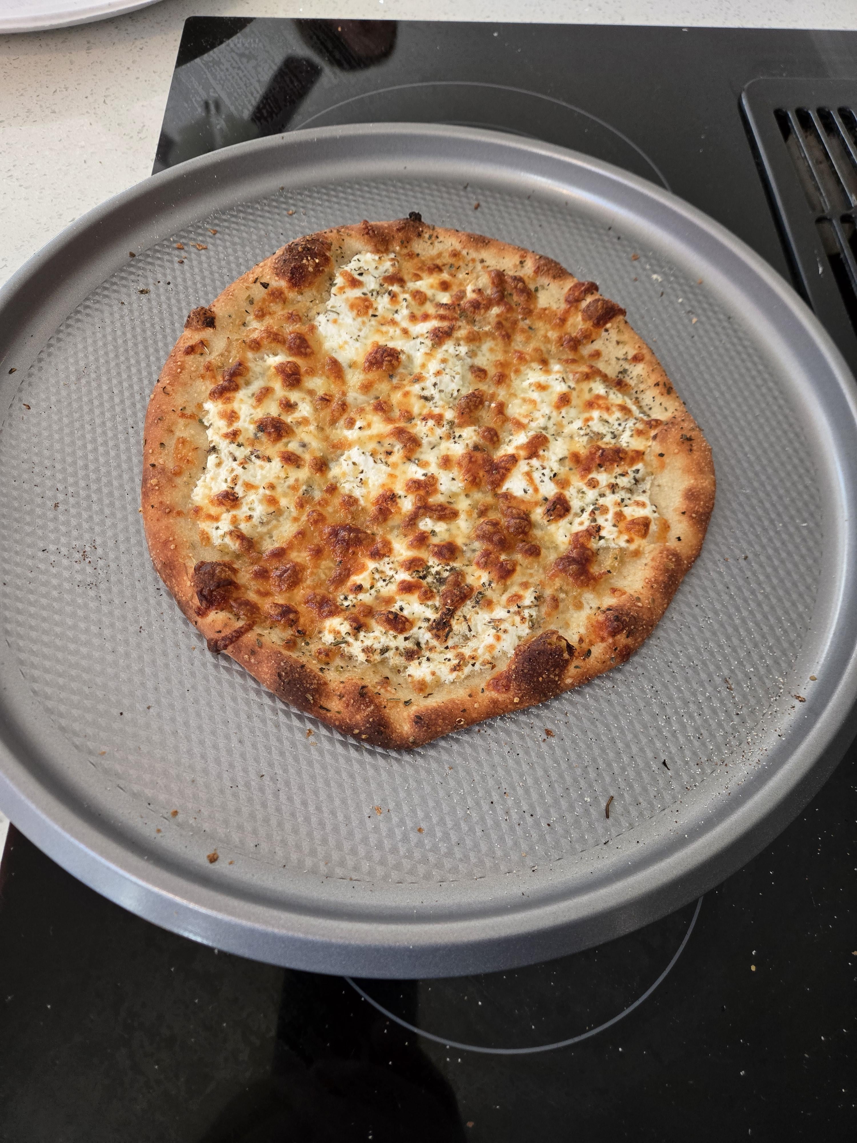 In the last couple of months I've been experimenting with bread making. It started with French Bread loaves, to Sandwich Bread loaves, to Sourdough, and in the last week I've been experimenting with pizza dough. This is my second attempt at a New York style crust. I bushes it with Olive Oil, spread roasted garlic on it like a paste, added dollops of ricotta, whole milk mozzarella, sprinkled with parnigiano reggiano, and a light dust of Italian seasoning. Cooked in my oven at 550 on a stone.