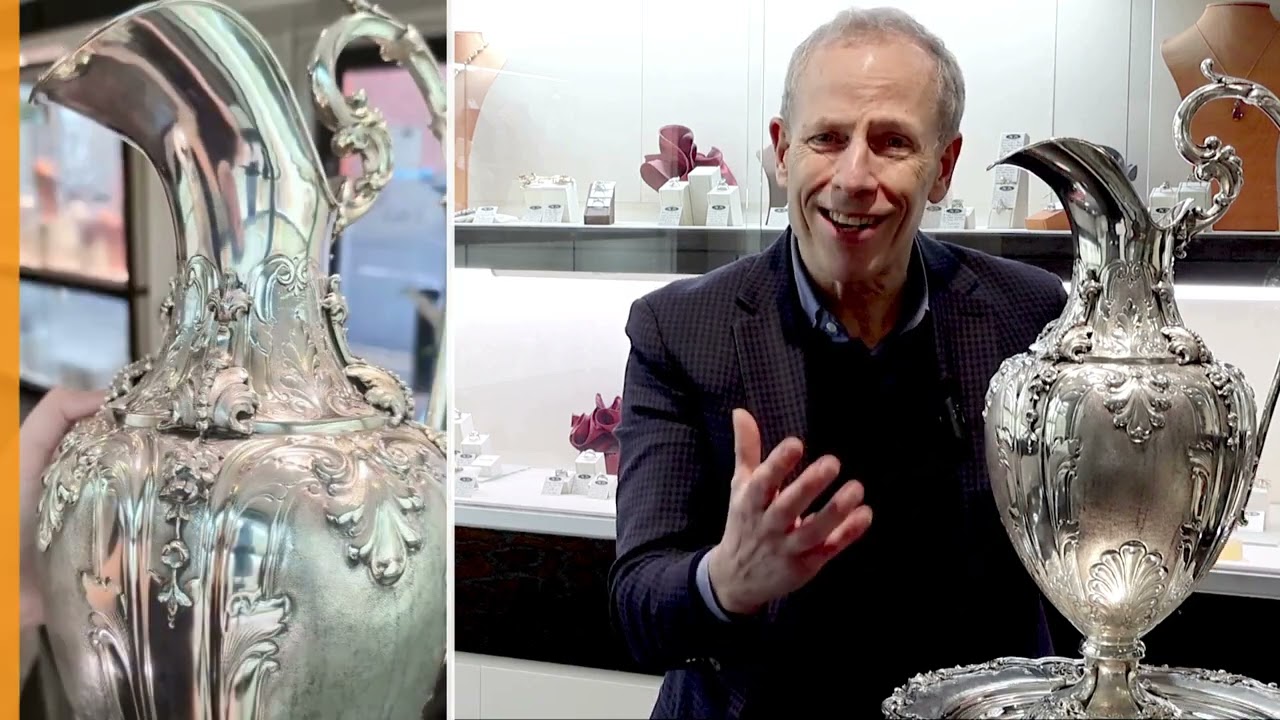 This exceptional and large ewer sits on the original hallmarked Italian silver presentation plate.