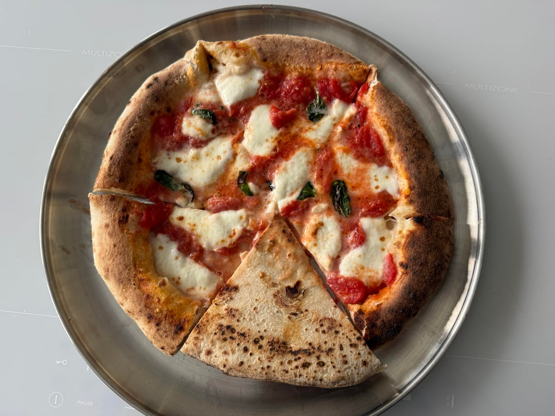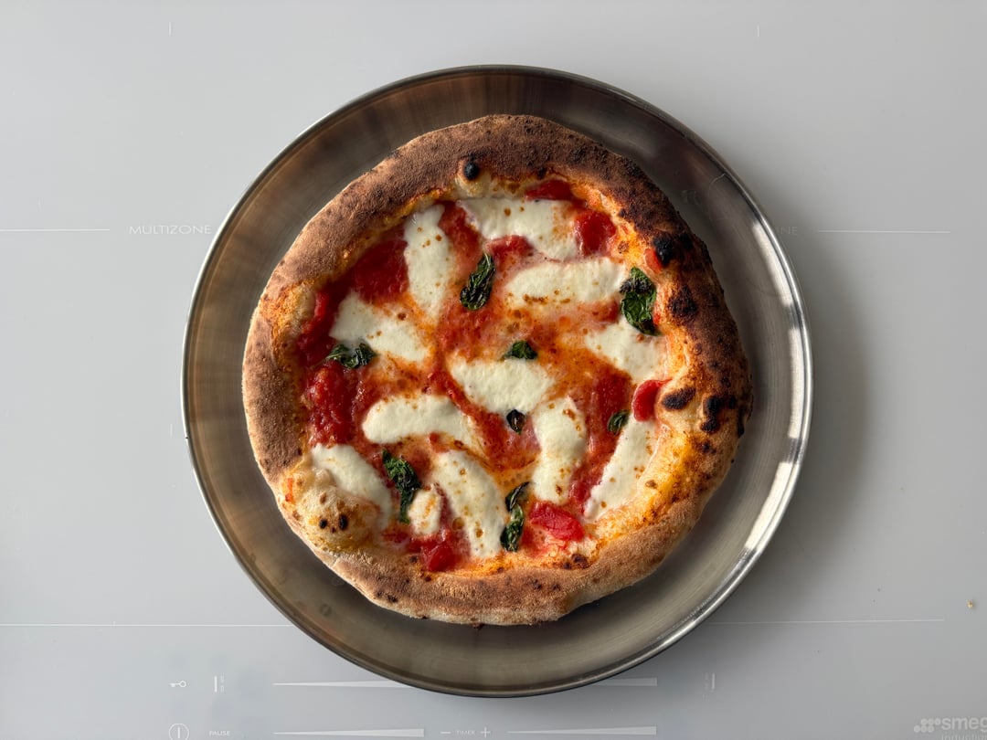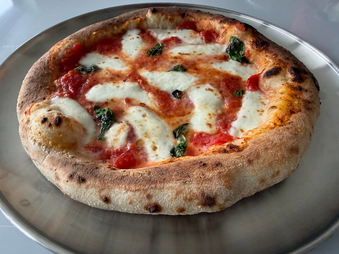 Makes 1x 270g base – 155g caputo pizza flour, 94ml water, 15g starter, 4.7g salt. 70g cirio tomatoes hand crushed, 80g fior de latte, 7g parmigiano reggiano, 7g EVOO, few basil leaves