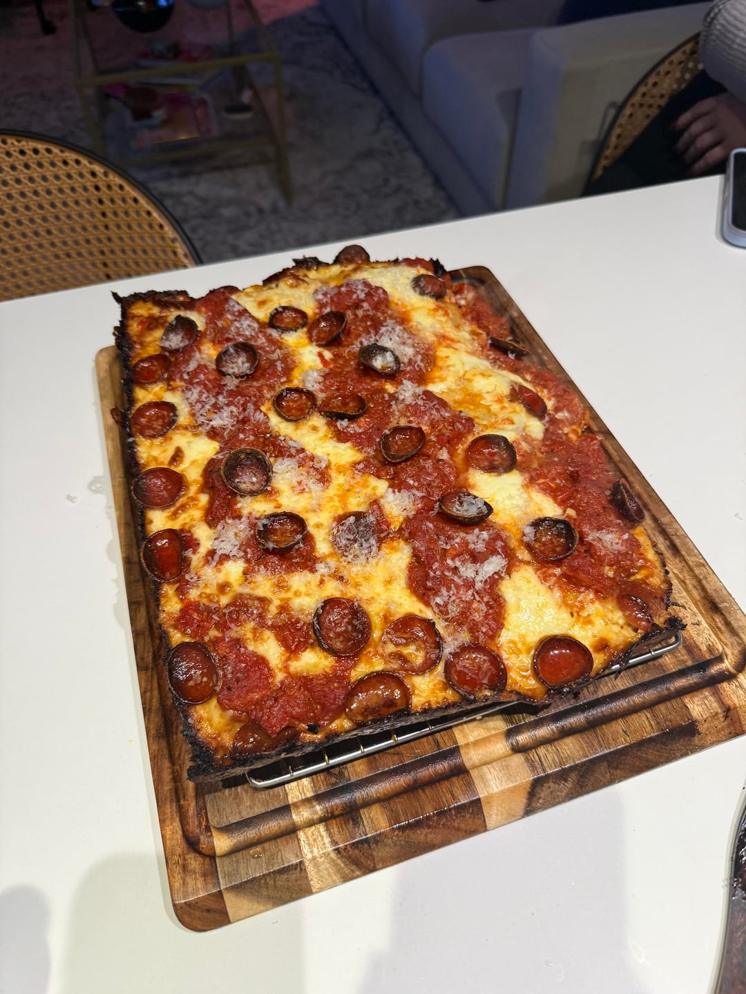 Thank YOU, Reddit! I made my first at-home Detroit style pizza yesterday for the Super Bowl and was so happy with the result. I imported brick cheese from Wisconsin, ordered cup & char pepperoni & found the Jet’s pizza copy cat dough recipe.