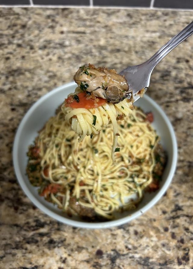 This is my favorite pasta dish to make: Linguine with smoked oyster. I know oyster isn't traditional, but the dish does have heavy Southern Italian influence (or at least I'd like to think so). Sauce base is olive oil, garlic, anchovies, pepper flakes, and parseley.