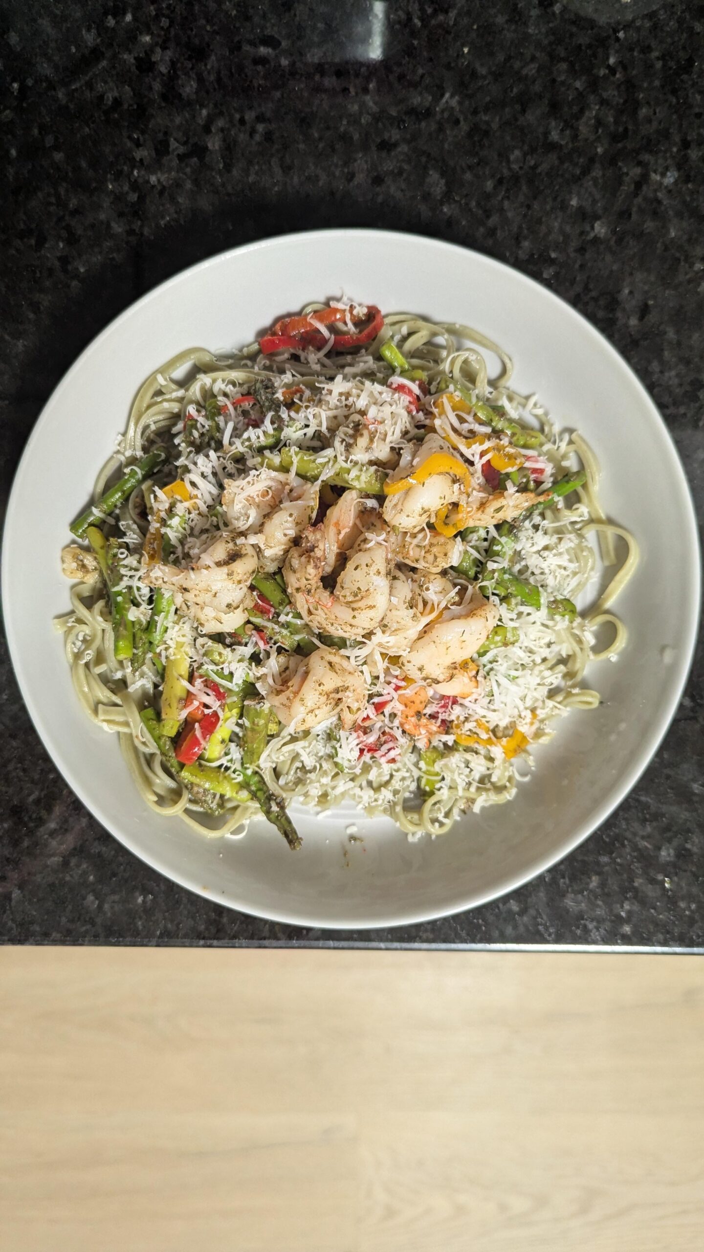 Spinach fettuccine with shrimp, asparagus and peppers sauced with Homemade pestoby Alternative-Fish-303 Homemade DishPastaWrite A CommentYou must be logged in to post a comment.