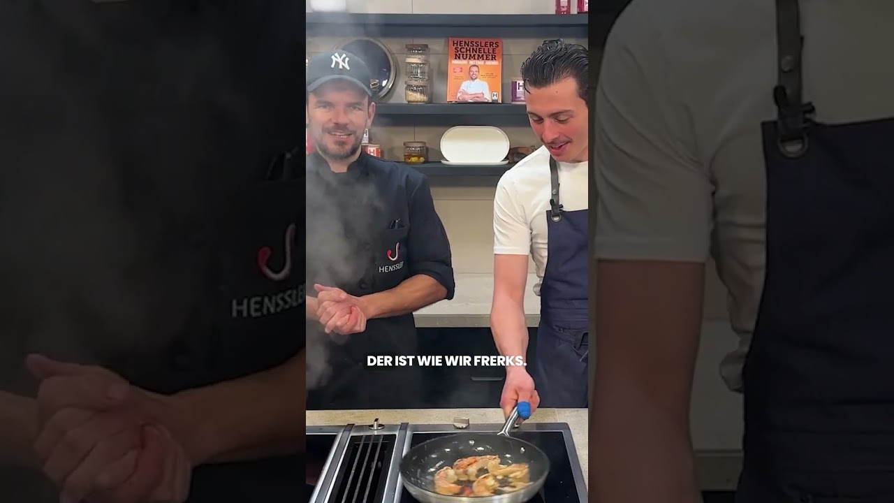 5️⃣ Garnelenköpfe und -schalen aus der Pfanne nehmen. Knoblauch und Garnelen hineingeben, bei Bedarf 1–2 EL Olivenöl ergänzen. Mit HENSSLERS Gewürzsalz und Pfeffermix würzen und die Garnelen von beiden Seiten goldbraun anbraten.