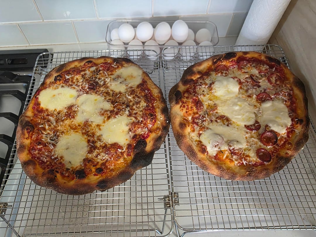 this is a 50/50 KA bread/AP flour dough with the bread flour used to make a biga. hydration is about 65. used a steel on the top rack with oven set at 550 for 1.5 before cook.