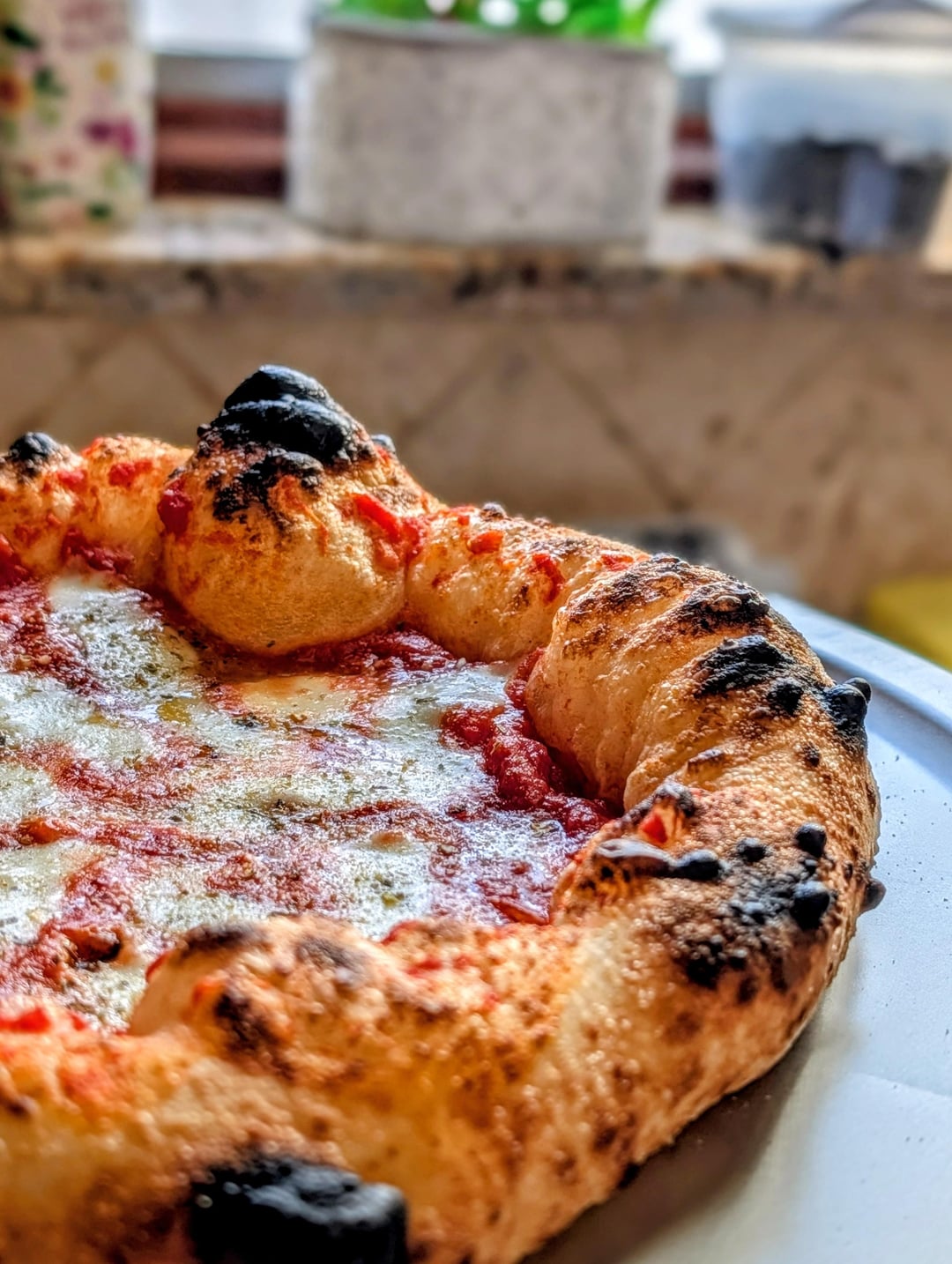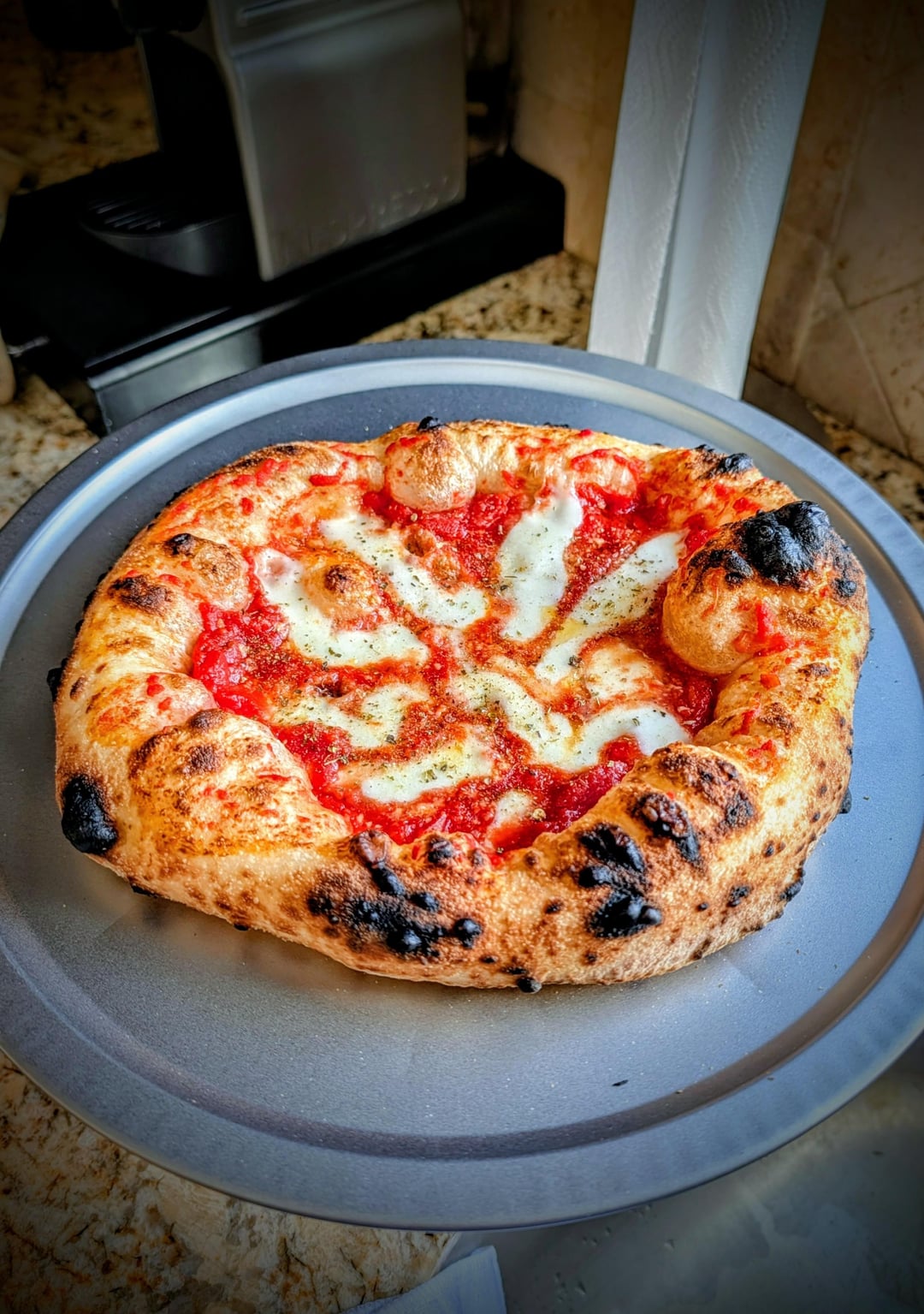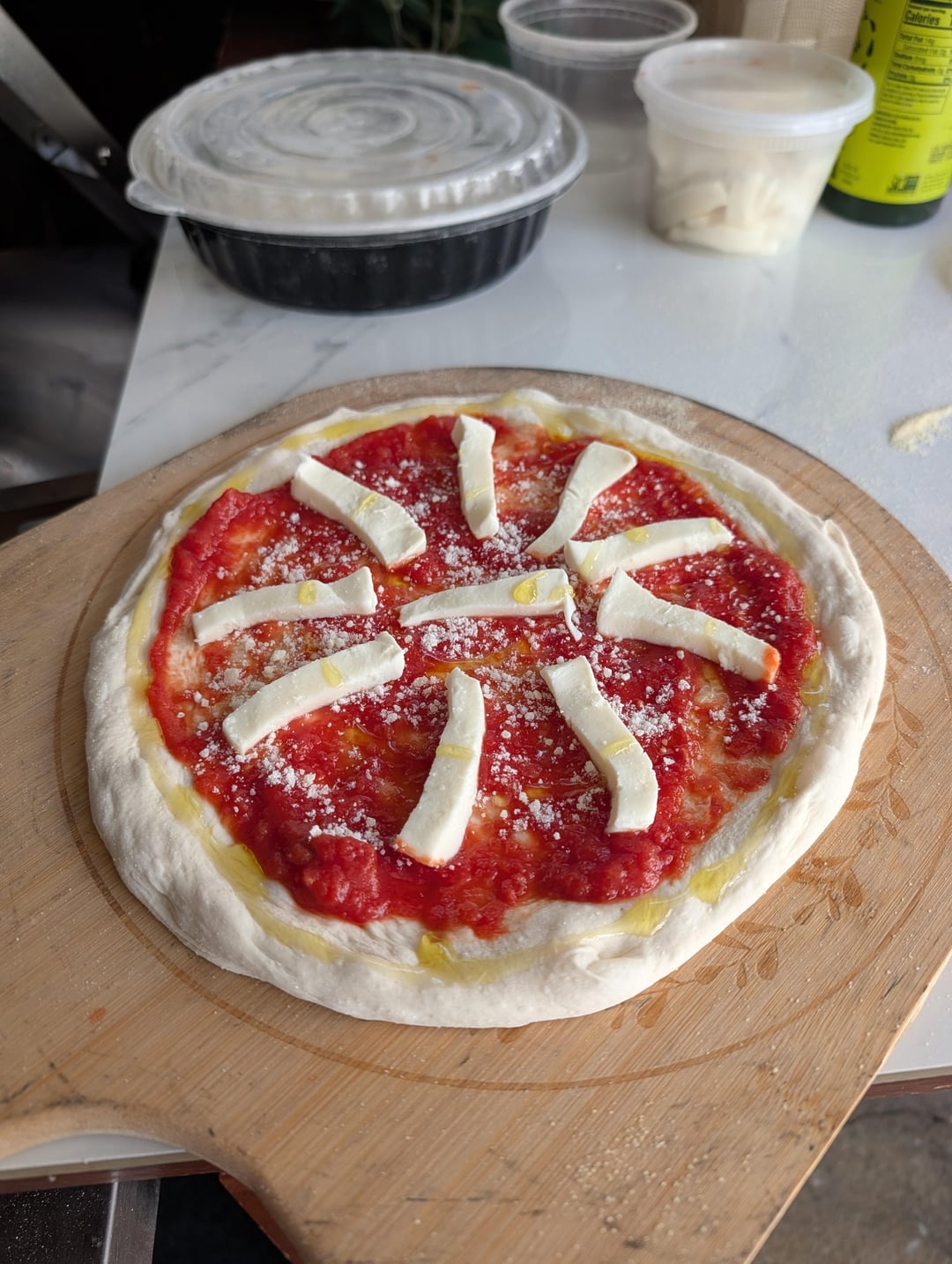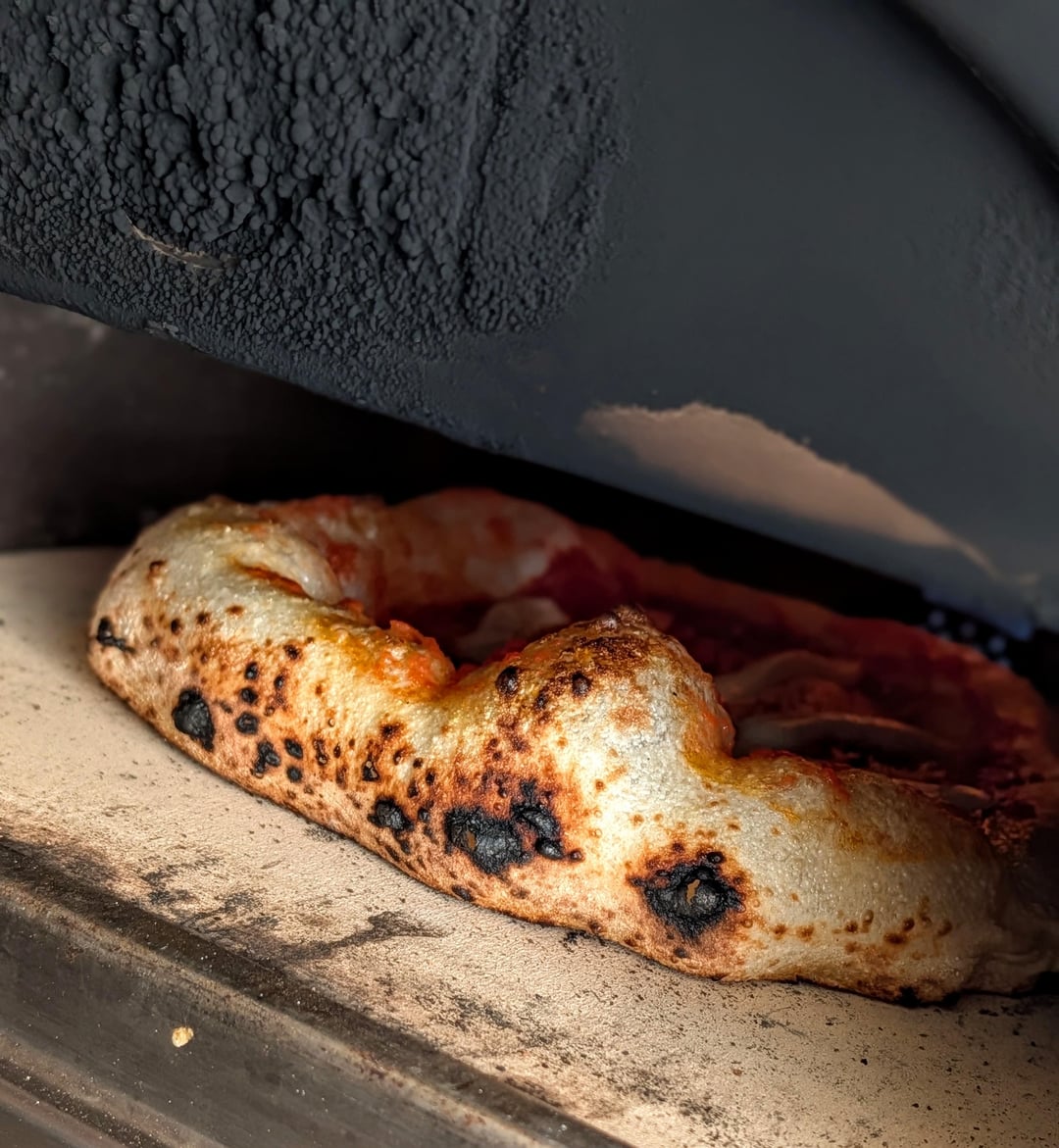 Topped with Mutti tomato, fresh mozzarella & locatelli pecorino. Cook that 800f with turns every 10-15 seconds
