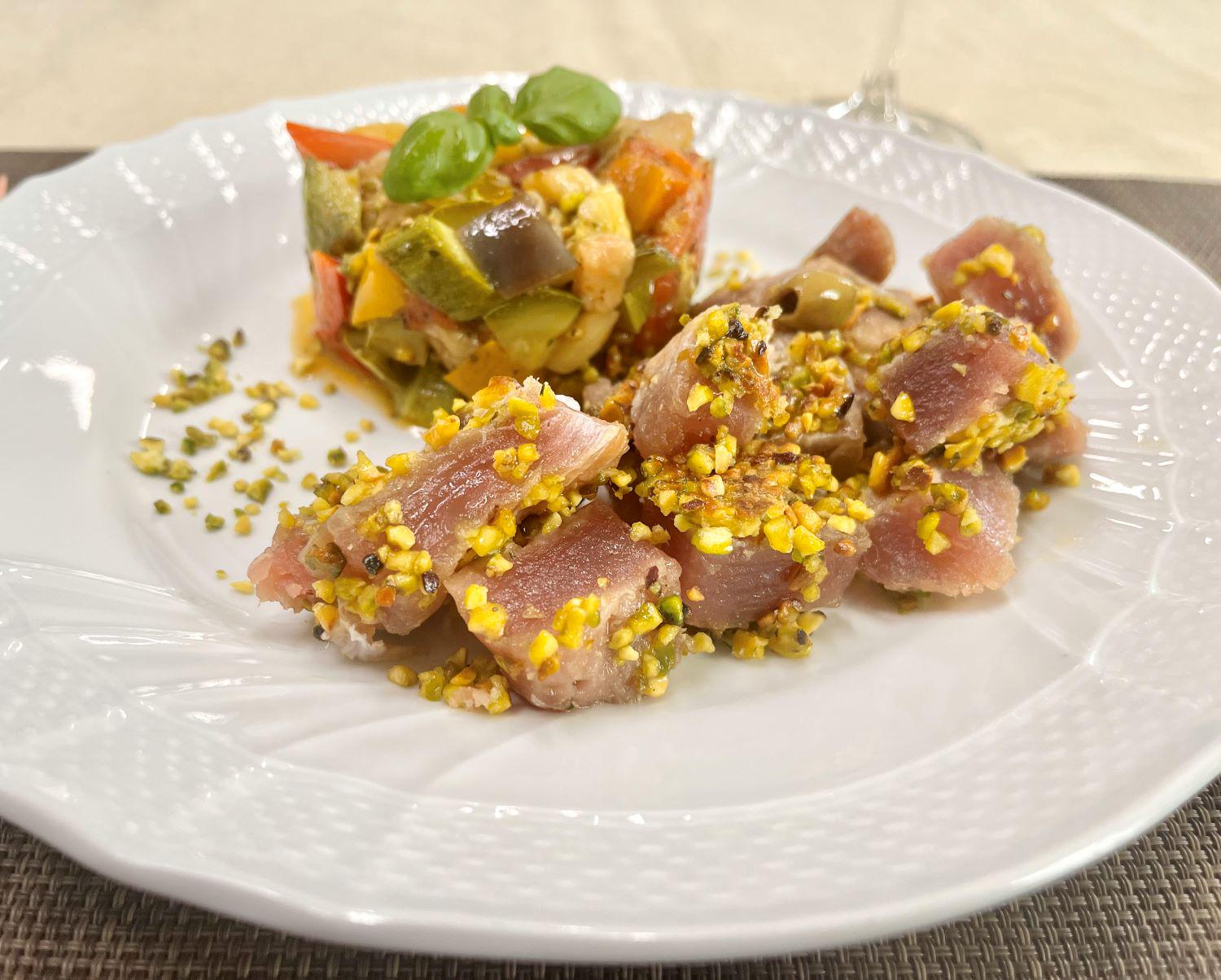 - Serve: Slice the tuna about 1 finger thick. Plate the warm Caponata at the bottom, place tuna slices on top, and finish with a drizzle of high-quality Extra Virgin Olive Oil.