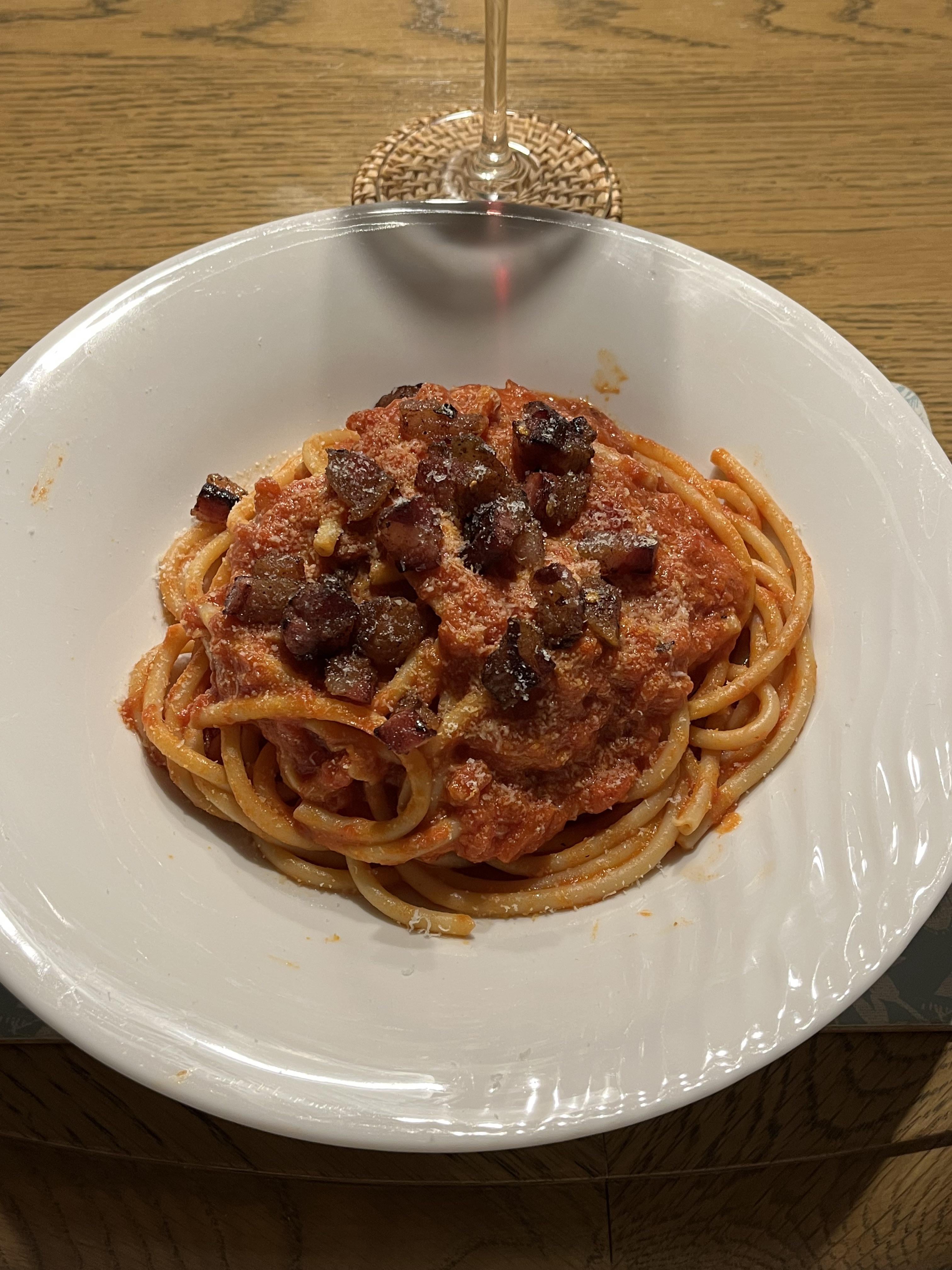 Made with Bucatini, thick cut guanciale, hand crushed tinned Sardinian plum tomatoes and Pecorino Romano.