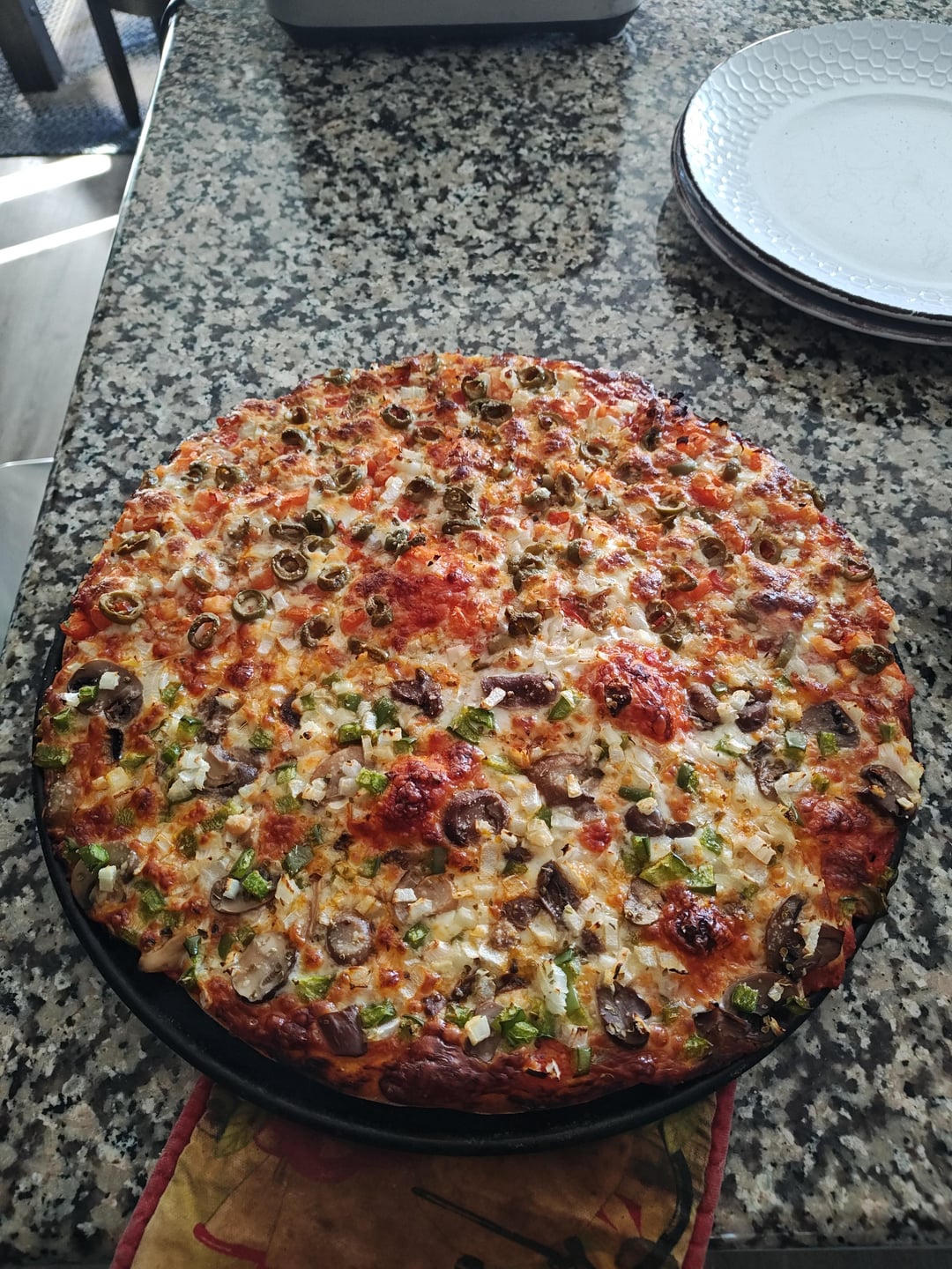 Homemade dough topped with smoked mozzarella slices, half mushroom, onion and green pepper, the other half bacon, tomato, onion and green olives. Baked at 495 for 16 minutes. Perfection!by Soulviolence66 NORMAL OVENpizza 1 Comment ornjos 4 hours ago That looks incredibleWrite A CommentYou must be logged in to post a comment.
