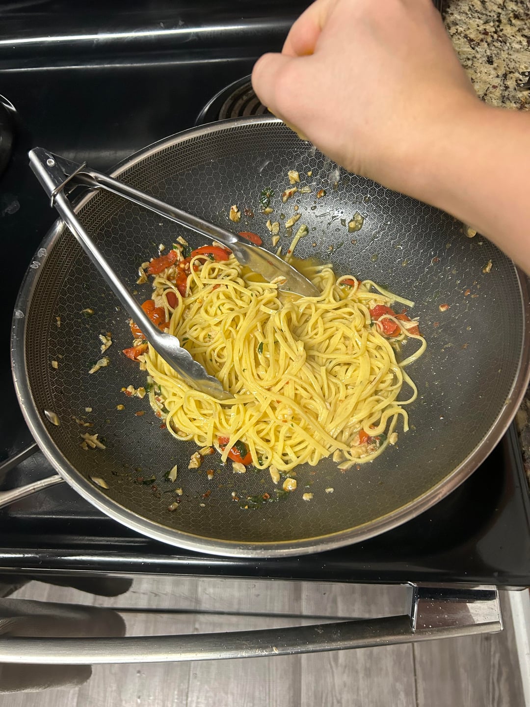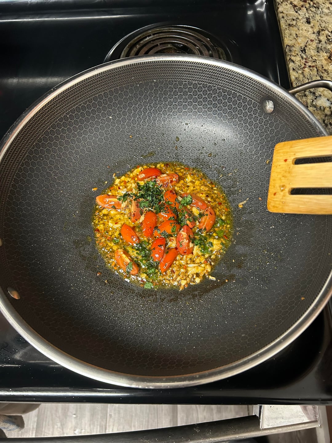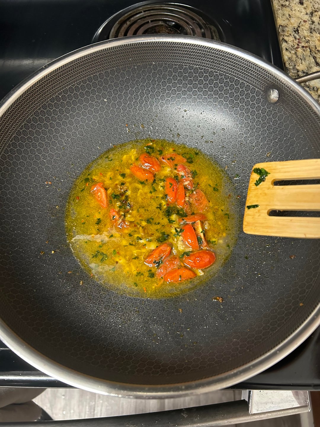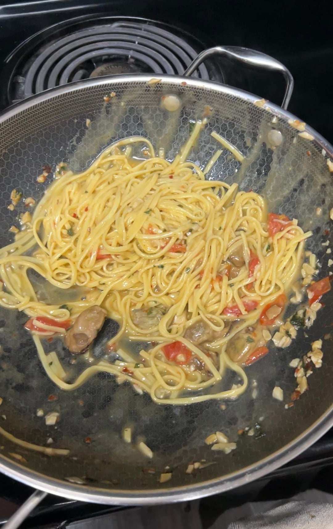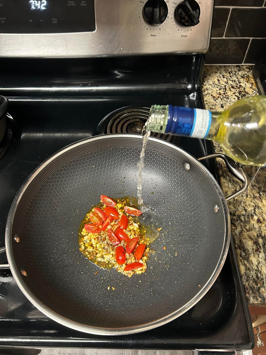 While anchovies are dissolving and garlic are getting soft, add grape tomatoes cut in 1/4 (not to be crushed), then increase the heat up to medium-high and add white wine. Let it bubble until alcohol scent is gone