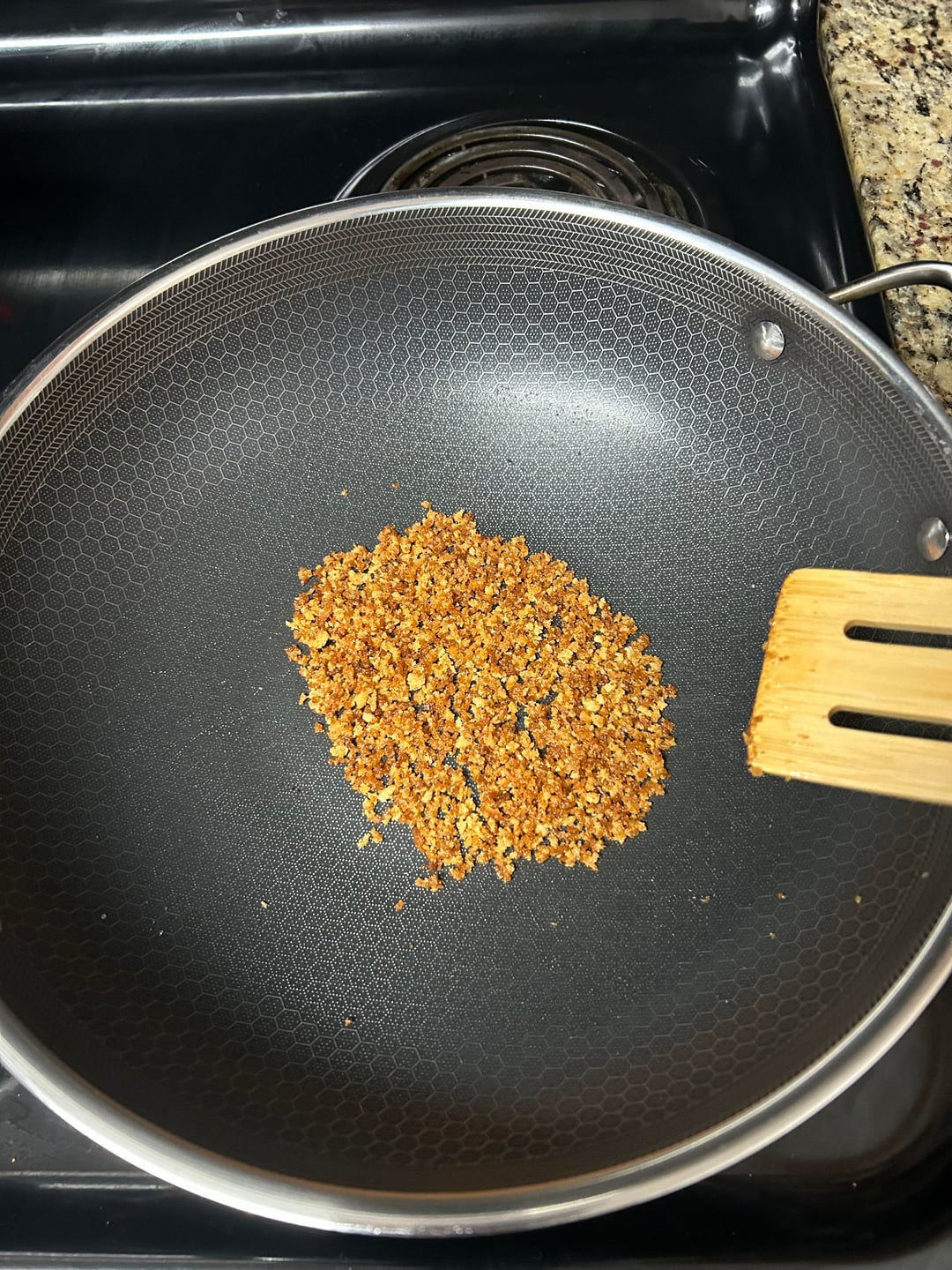 Toast bread crumbs with olive oil at medium heat until they're brown. Put them away once done and wipe the pan