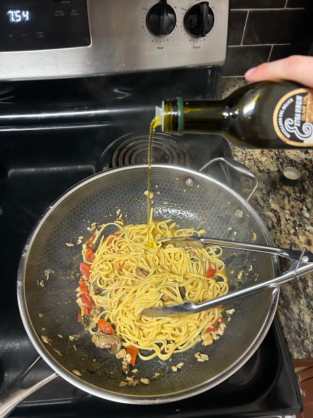 Ingredients: Fresh linguine, smoked oyster can, anchovies, garlic, grape tomatoes, bread crumbs, parsley, pepper flakes, olive oil, white wine, lemon, salt