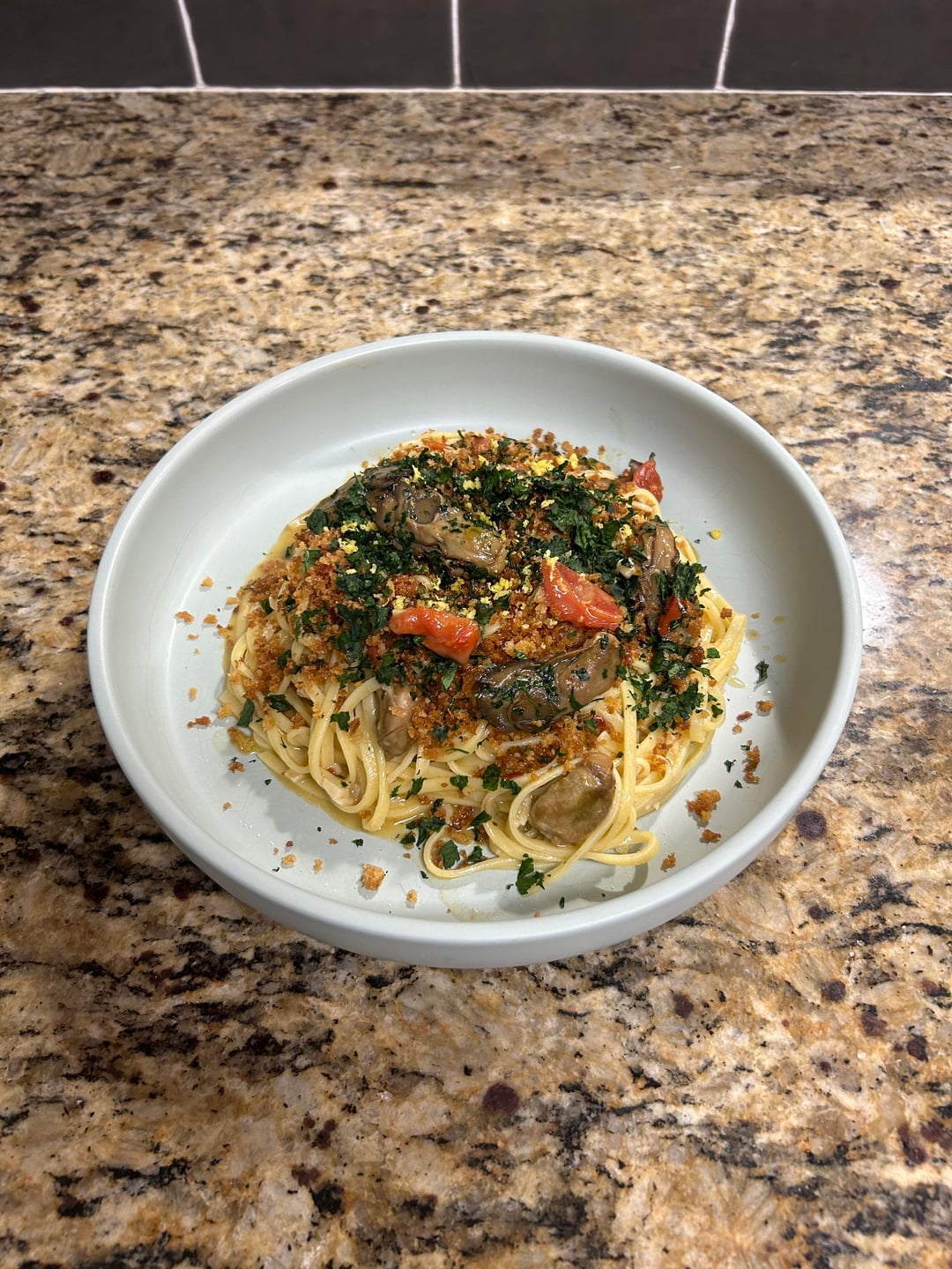 Plate the finished pasta and add toasted bread crumbs, parsley, lemon zest, and remaining oysters