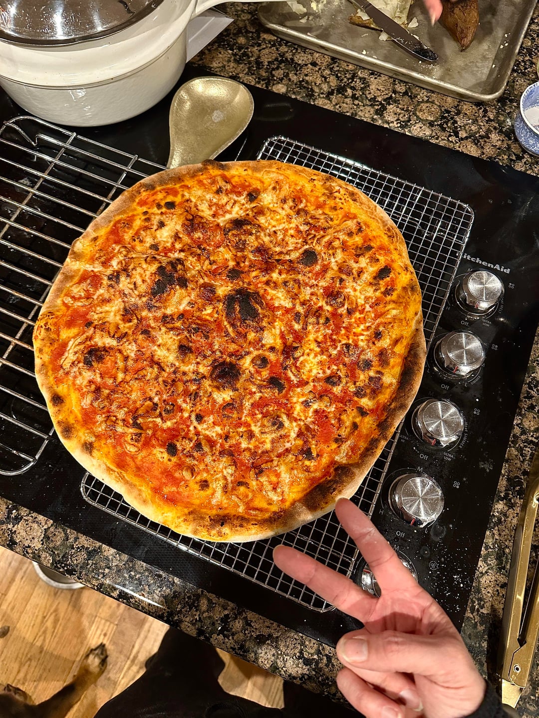 Used a same day ny style recipe found posted here a couple of days ago, pretty simple n worked out great 👍 normal oven at 525~ baking steel wasn’t hot enough, probably could’ve let it go longer without broiling at the end but still tasty.