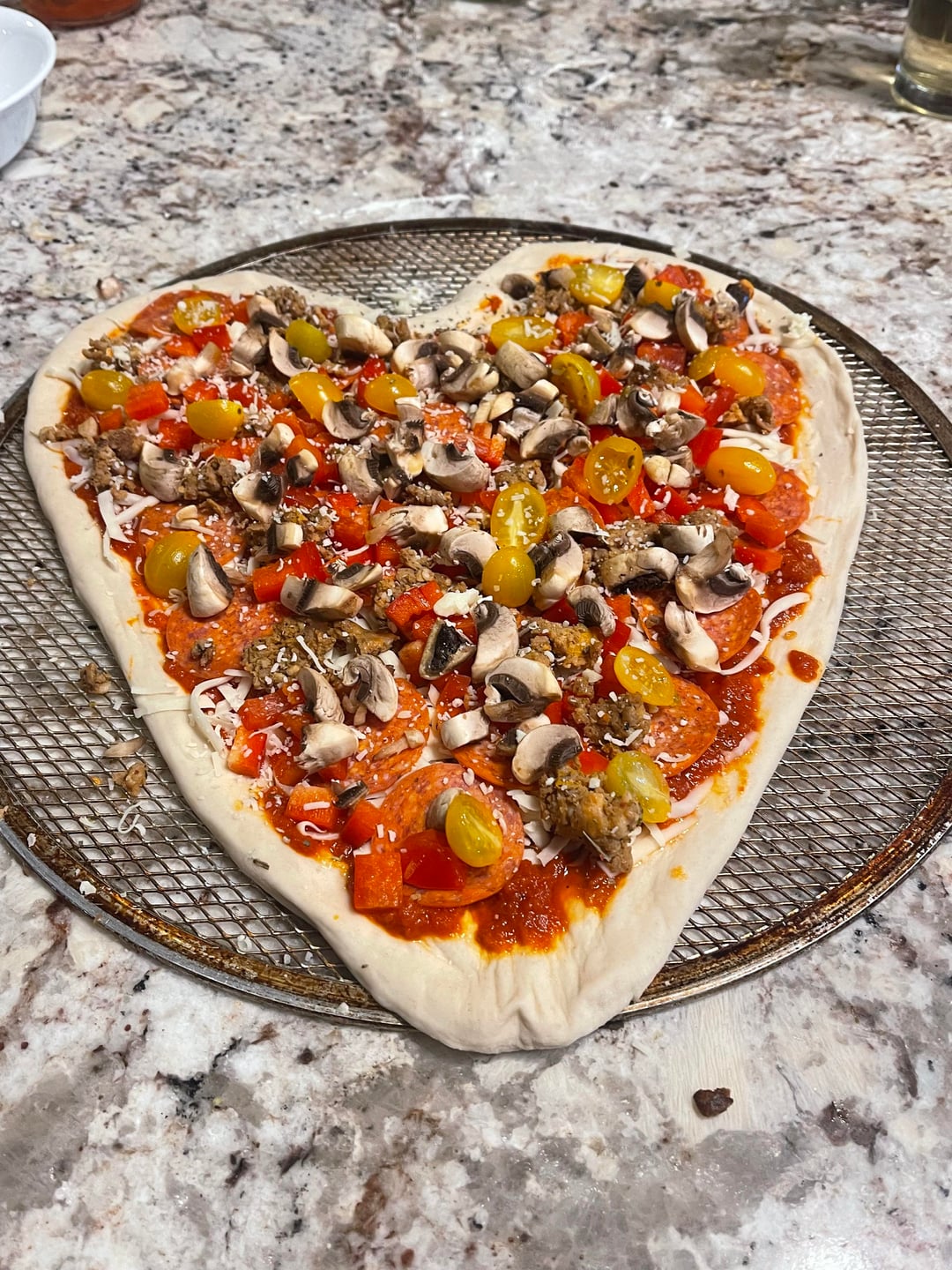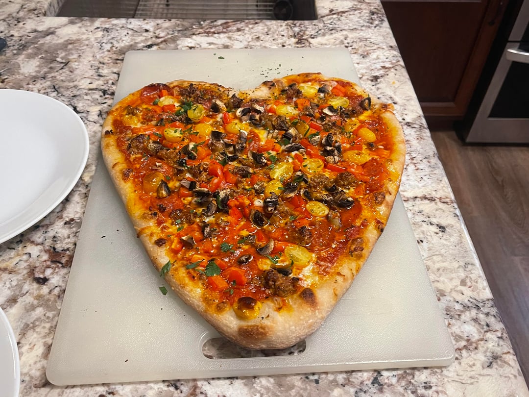 I saw a couple of pictures of heart shaped pizzas, so I figured I'd give it a try. The wife thought it was romantic and delicious, a great start to the V-day weekend! Pepperoni, Italian sausage, peppers, mushrooms and tomatoes, cooked on a Weber Genesis for about 11 minutes. She said I've earned some points for once.😂🍕