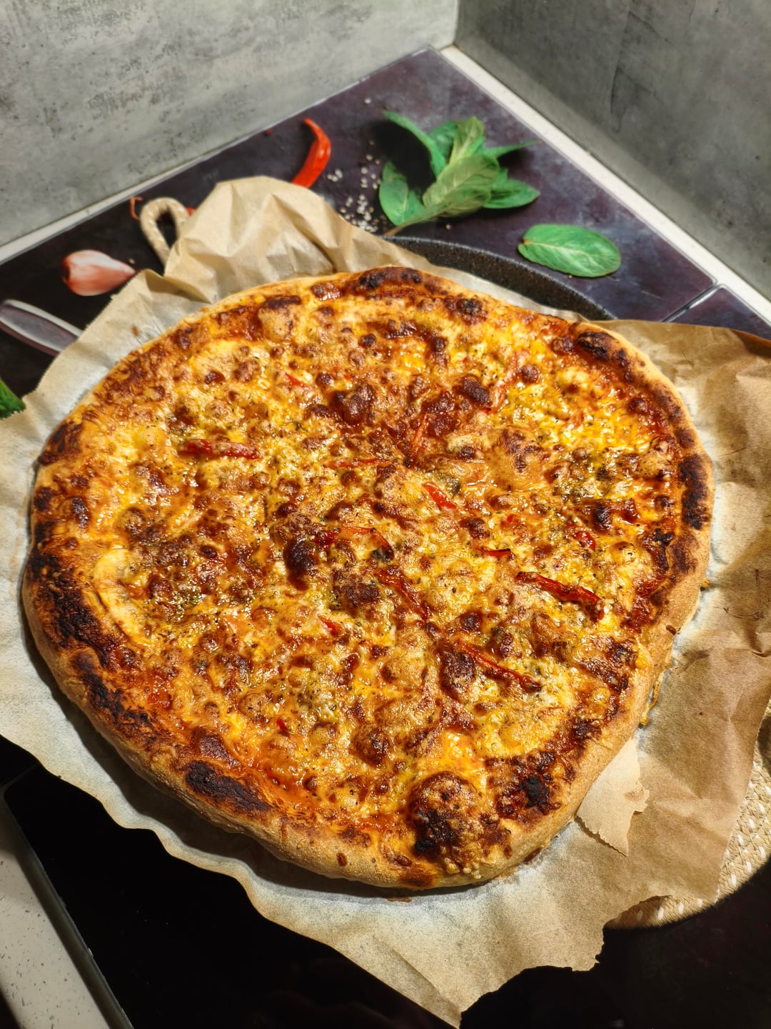 48 hour fermented dough, 65% hydration, mix of gouda-mozzarella-cheddar cheese, mushrooms, red pepper, sause. ✌️