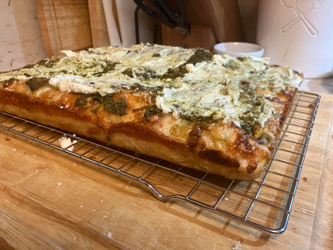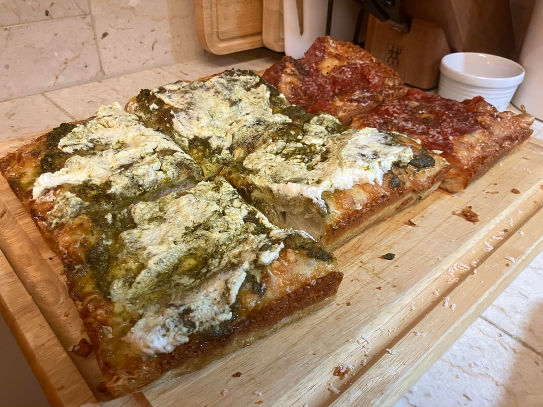 The tomato & soppressata pie went a couple minutes too long, but was still good (even better reheated the next day). I adjusted for the pesto ricotta pie and got a crispy crust, with a soft and pillowy inside on that one.