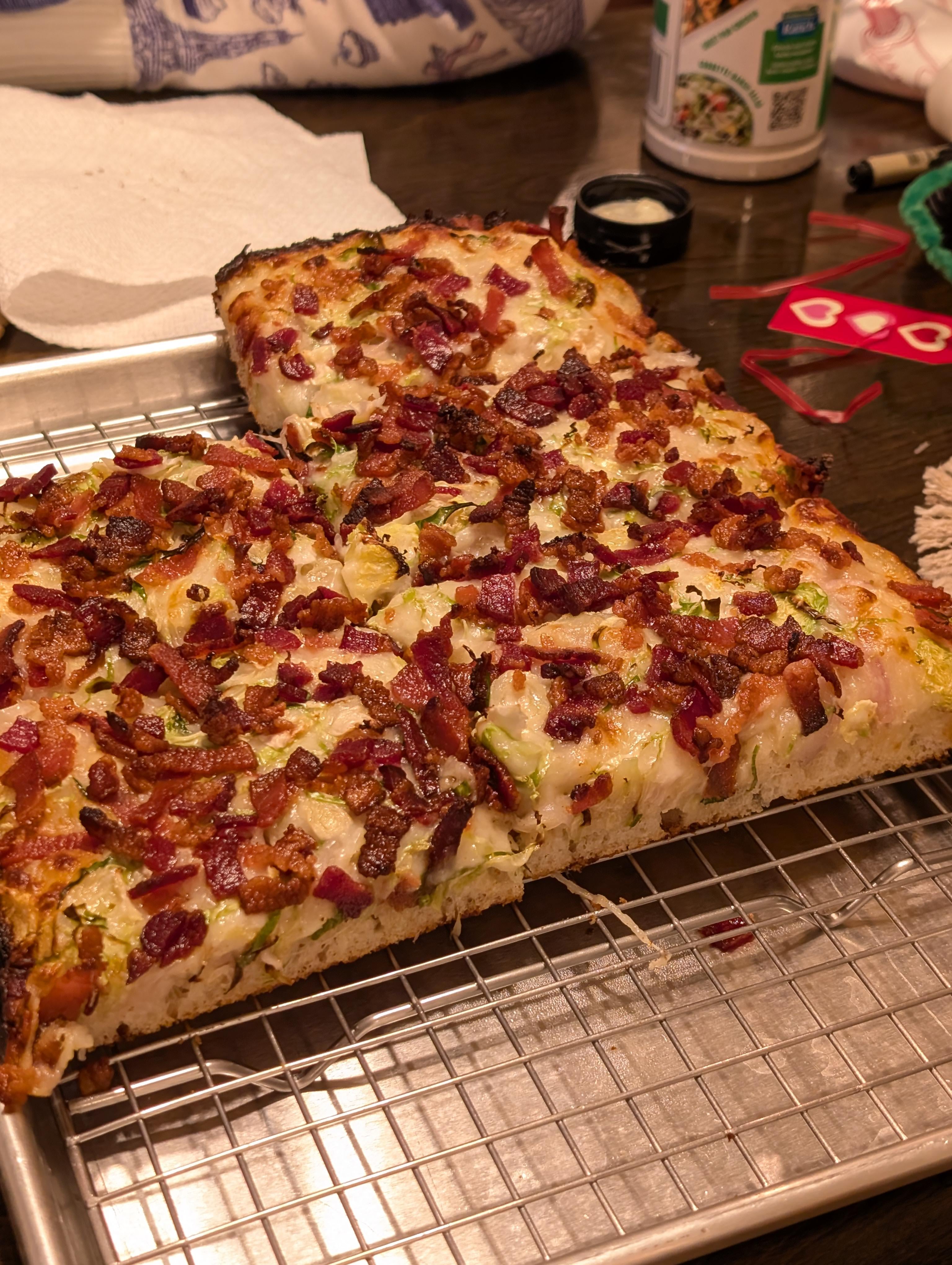 This is a topping copy of the Honey Pie pizza from Clarksville in Philly, but on a Detroit Style dough. I use a mandolin to get the red onions and brussel sprouts shaved super thin. Goes great with a ranch if you're a dipper.