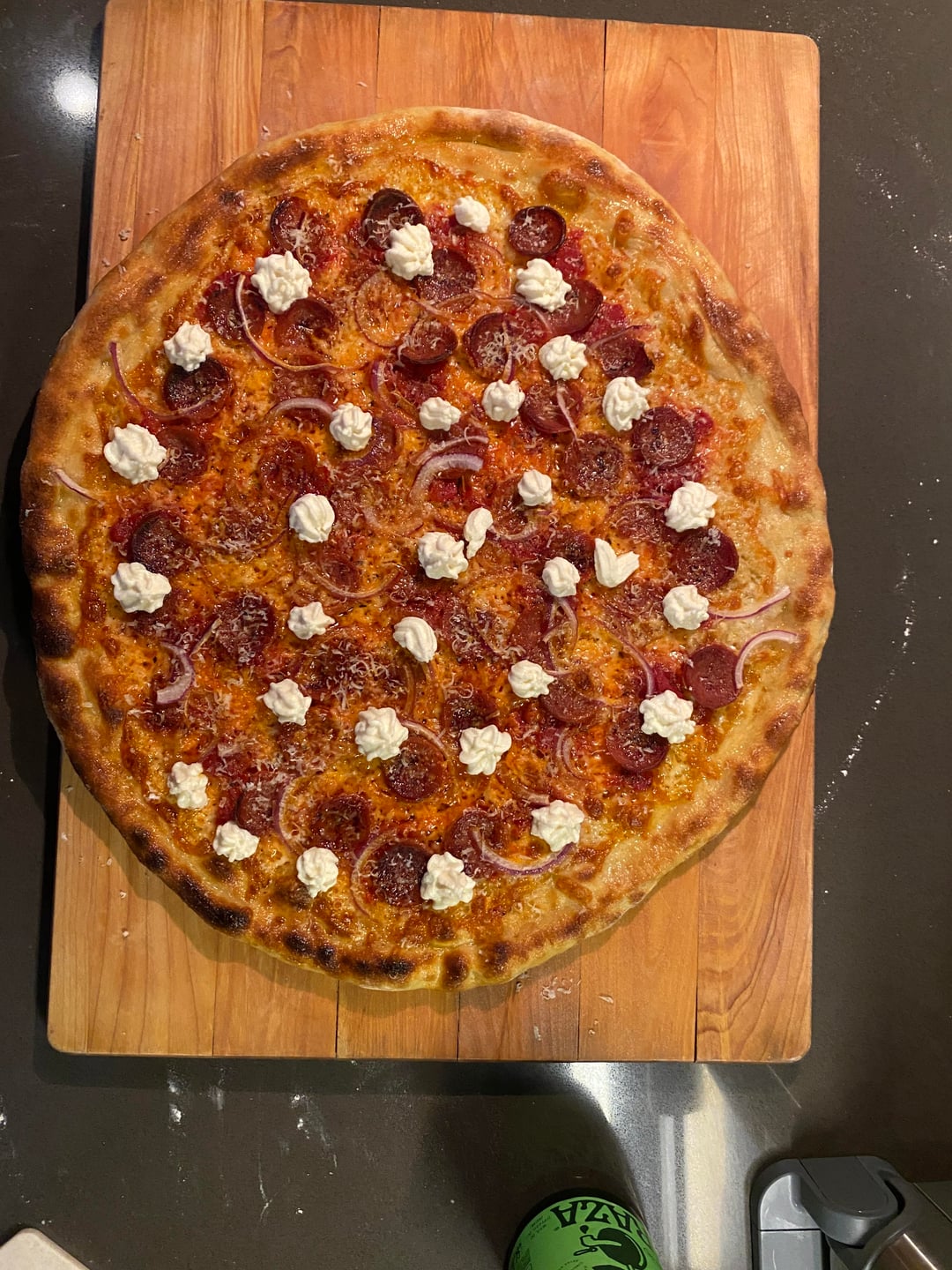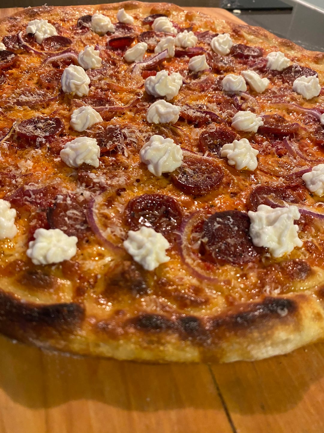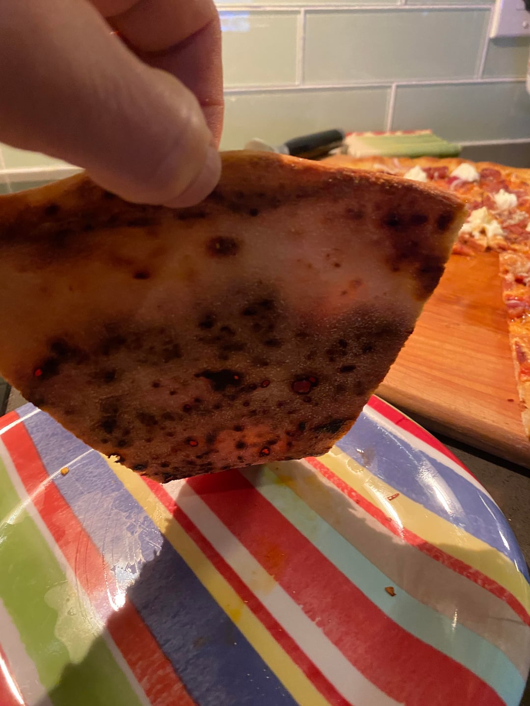 This one was re-balled and then frozen for a week before cooking. It turned out great. The dough itself lacks flavor, but it stretches well, and more than does the trick it’s being asked to do. It is great for making a pizza day of wanting one, for sure.