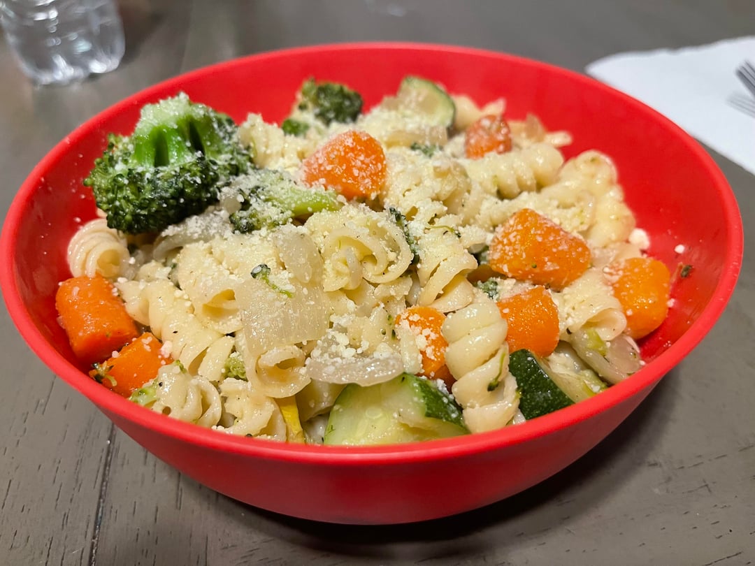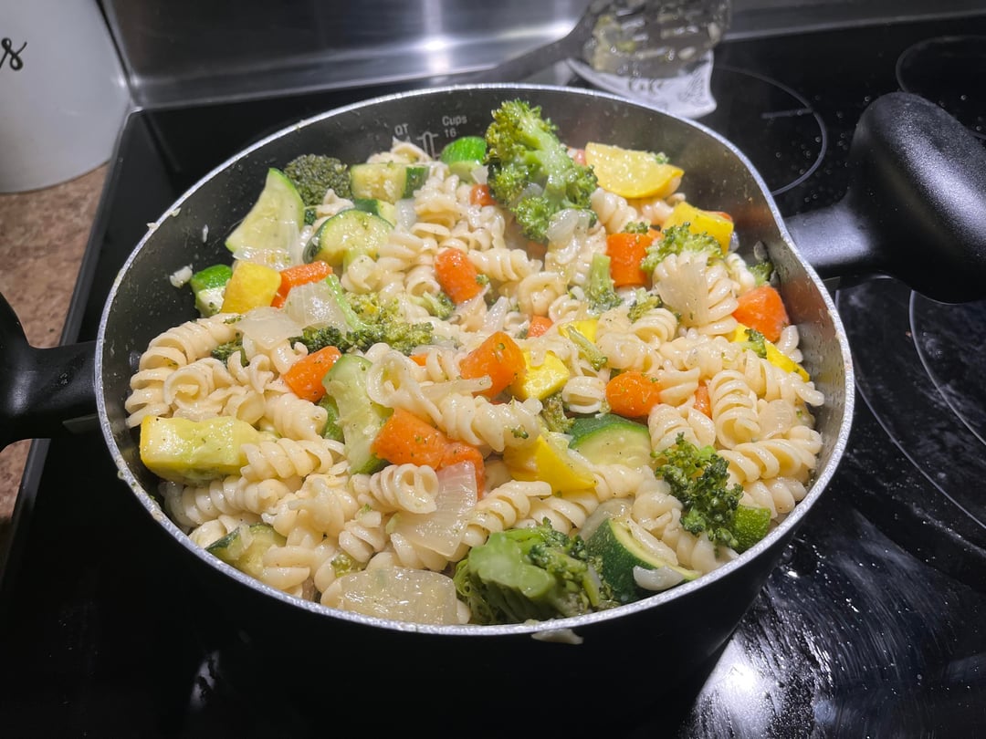_CandidCynic_ 2 hours ago • 1 pound rotini macaroni.• Three green squash, two yellow squash, chopped.• One bag baby carrots, chopped.• Two brocolli florets chopped.• Two small yellow onions, minced.• Onion powder, garlic powder, complete seasoning, salt and pepper. All 1/2 teaspoon sprinkled in.• Sauté the vegetables in this order. Onions 4-5 minutes. Carrots and brocolli 5 minutes. Brocolli 6 minutes. Use olive oil when sautéing.• Boil pasta in between vegetable sauté. Drain and add vegetables. Stir and add butter generously. Serve with Parmesan cheese grated.