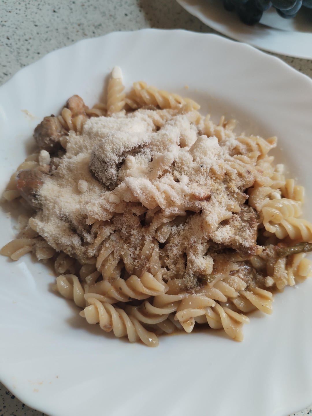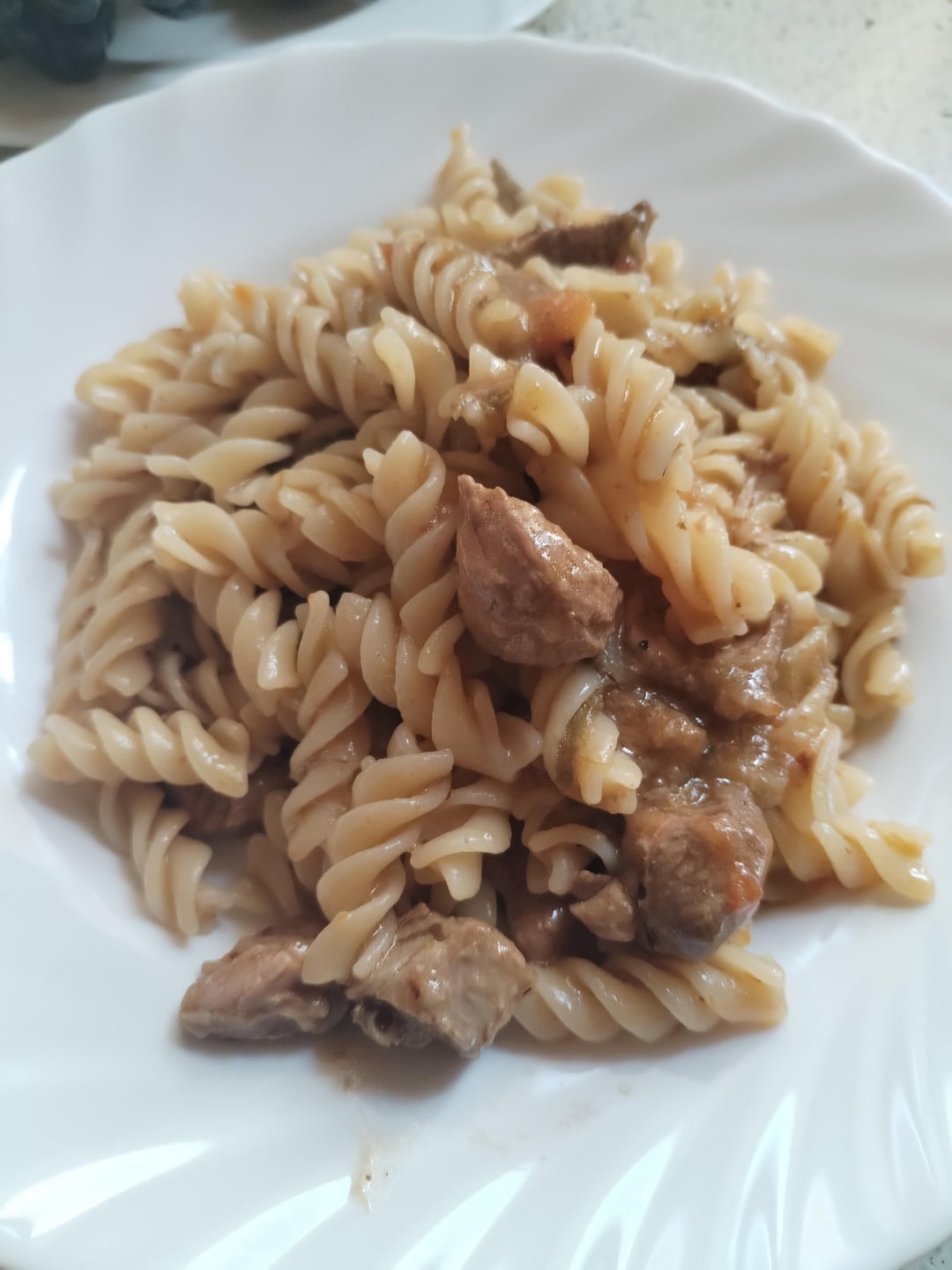 Mostacholcon pasta with a little meat and cilantro 🤤