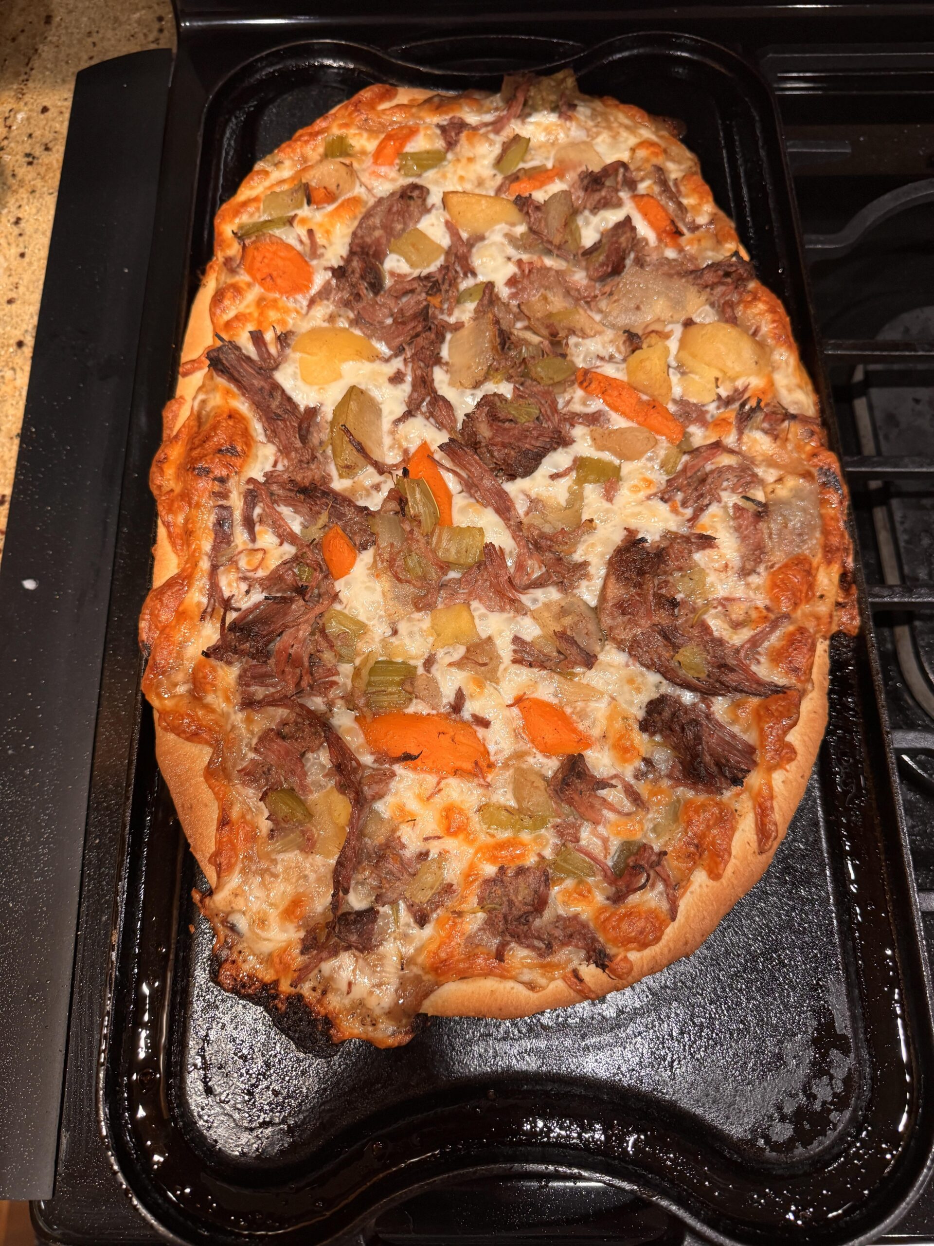 So I made dough, use gravy as the sauce, and the left over pot roast as the toppings. Yes, carrots, potatoes, celery and all.by MountainRambler395 NORMAL OVENpizza 4 Comments Adventurous_Dog_1326 2 hours ago this should be a crime to the Geneva convention btossa80 2 hours ago Yikes No-Pizza-4611 1 hour ago I wonder how this wouldve been as a pocket like chicken back style. Ooo with extra gravy for dipping. RolandTheHeadless19 1 hour ago I typically wouldn’t use the gravy or veg and just make a BBQ beef pizza, but honestly this looks good!Write A CommentYou must be logged in to post a comment.