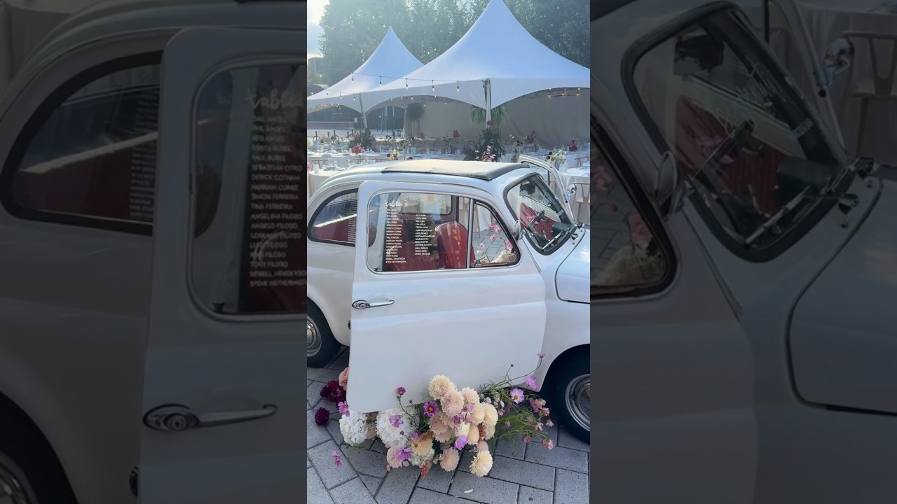 At the reception, a vintage Fiat greeted guests, red seats glowing inside, florals spilling out. Laura had hand lettered the seating chart directly onto the windows herself. It felt intimate. Personal. Completely them.