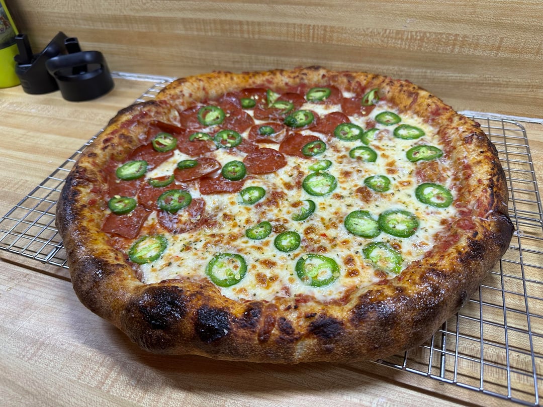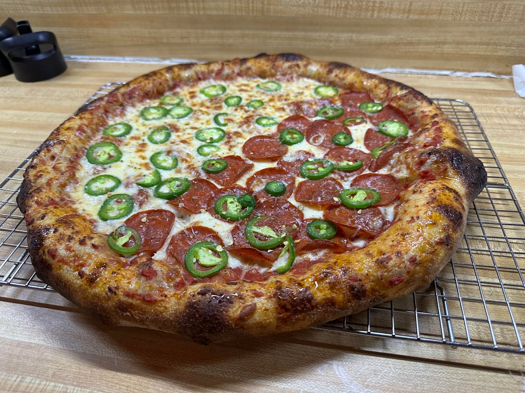 24 hour room temp fermented dough. Hand crushed San Marzano tomatoes with salt, black pepper, red pepper. Mozzarella, pepper jack, Parmesan, pepperoni, jalapeños. Finished with olive oil and Parmesan Reggiano.