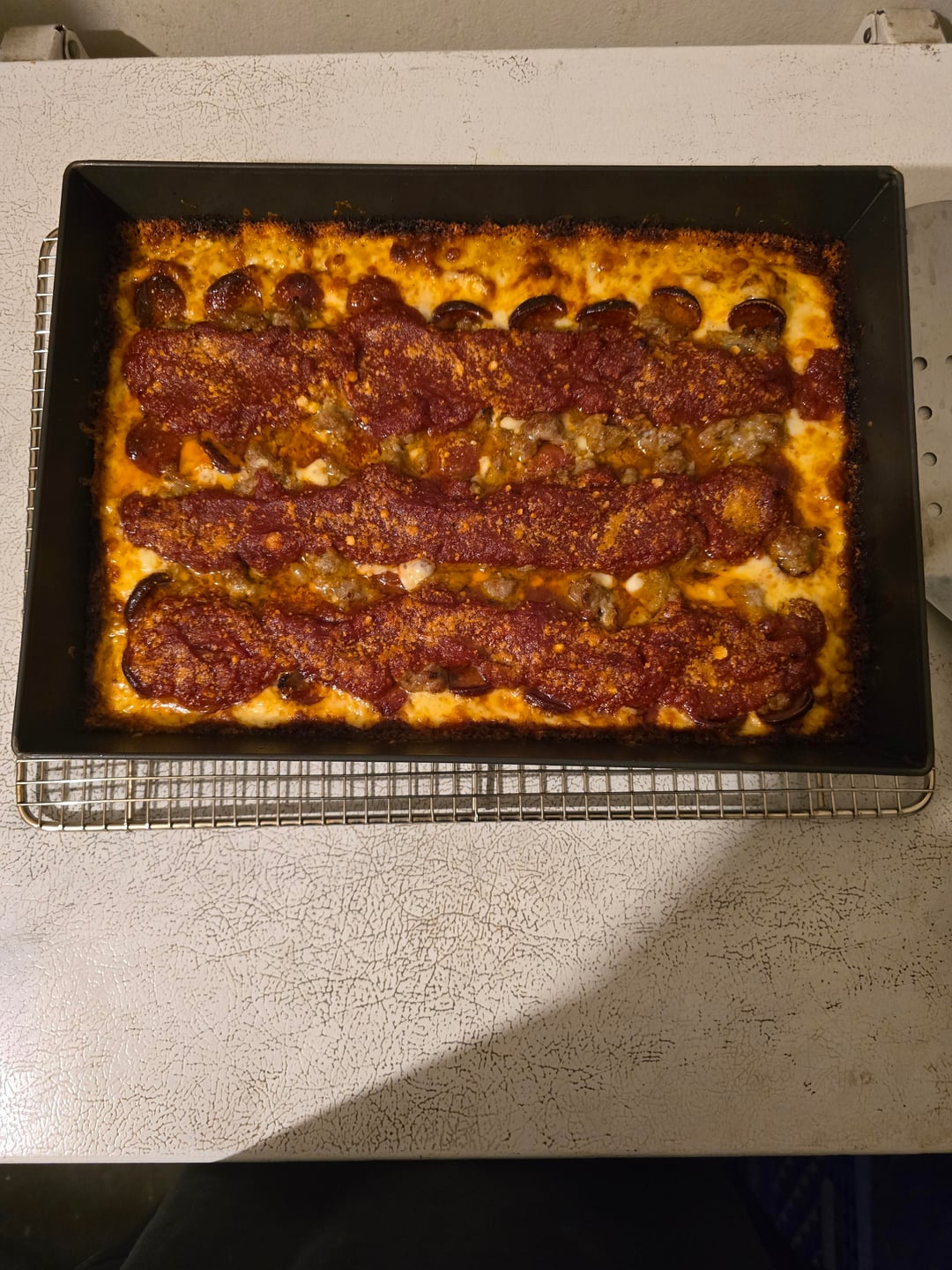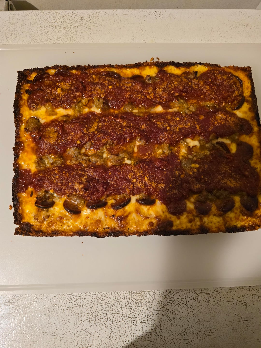 This is a pepperoni and sausage.. I used a baking steel with the oven rack in the lowest position. I have an electric oven that goes to 500. The next time I'm gonna put smaller sauce stripes. I used a mix of 50% brick, 25% mozzarella and 25% Monterey jack. It took 17 minutes at 500.