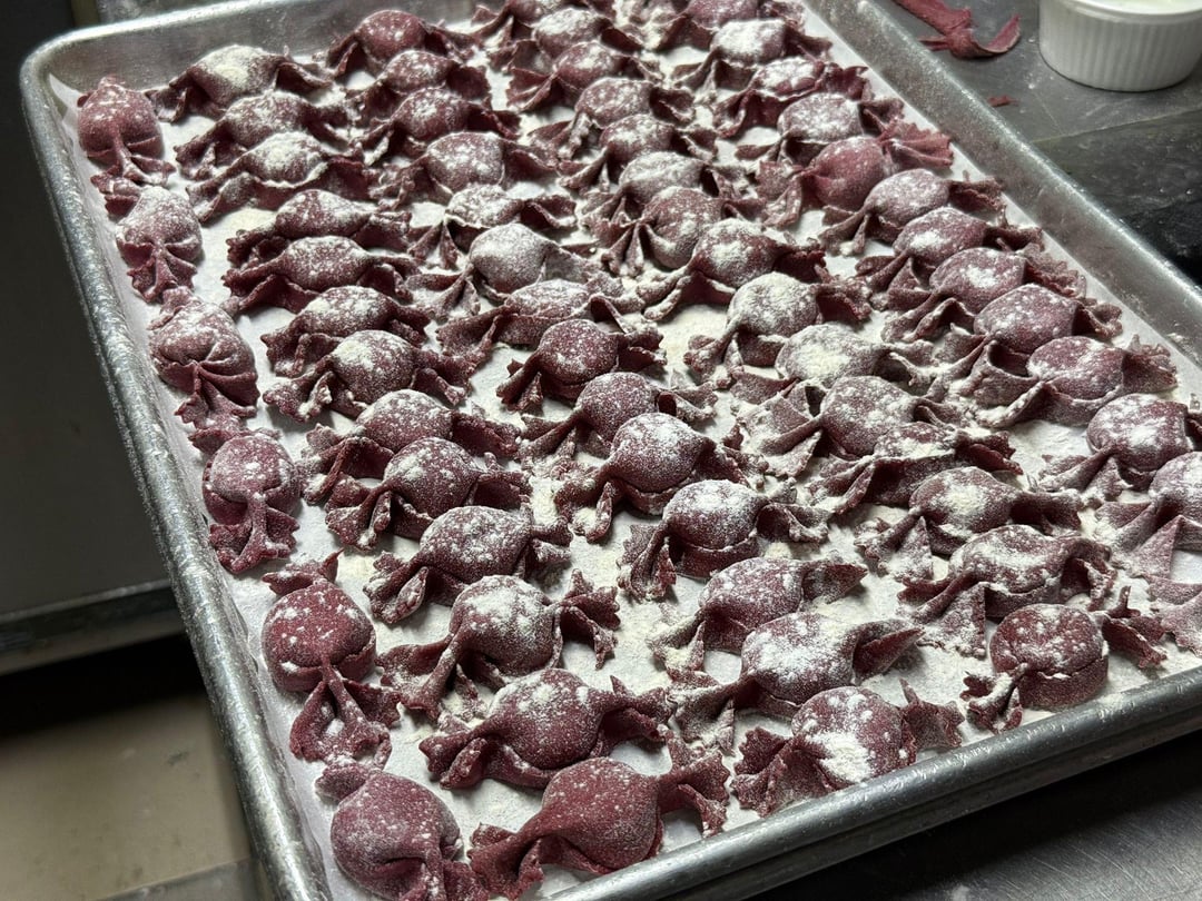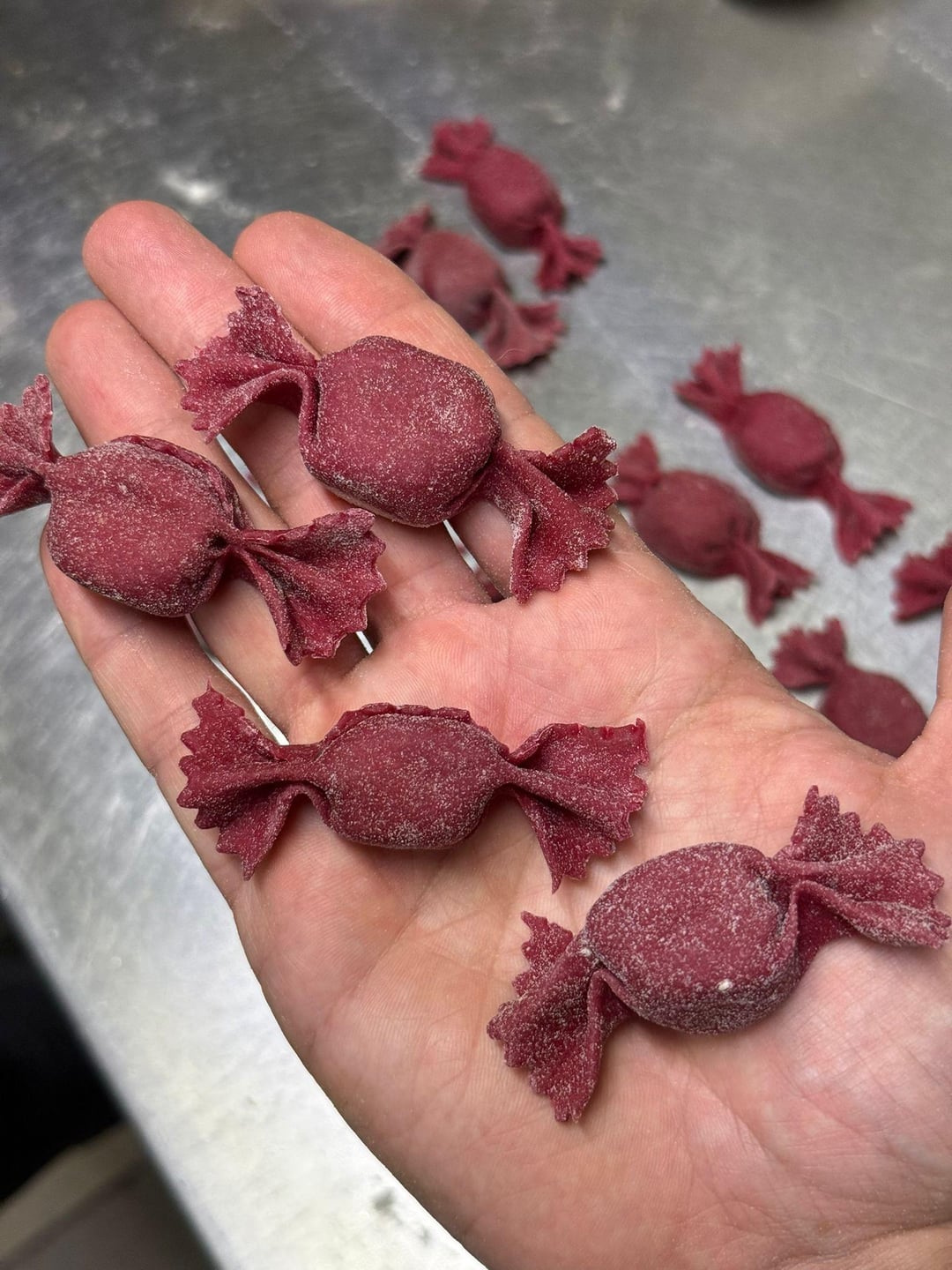 This year in the restaurant I work we made a different shape of ravioli I wanted to make for a long time. Shaped like a candy 🍬 they’re called “Caramelle”, we made them in a beetroot dough with a spinach and ricotta filling on a goat cheese creamy sauce. Sounds like a lot but I promise they were perfect and the mix of all the flavors was just impeccable ☺️