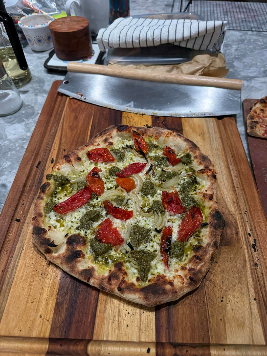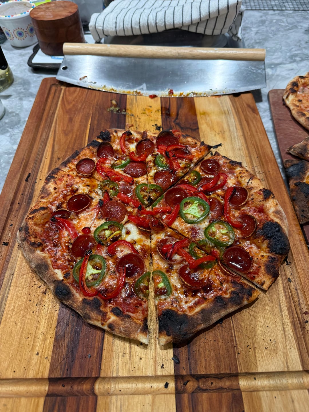 Kid-Cheese, kid-pepperoni 1, kid-pepperoni 2, House, pesto w/ roasted tomato, white mushroom truffle (not pictured), and two pictures of the habanero-garlic sweet-n’-spicy.