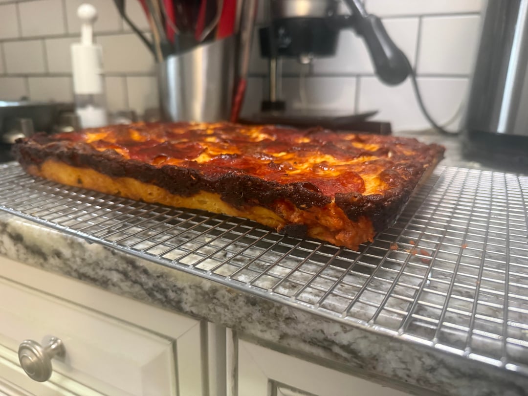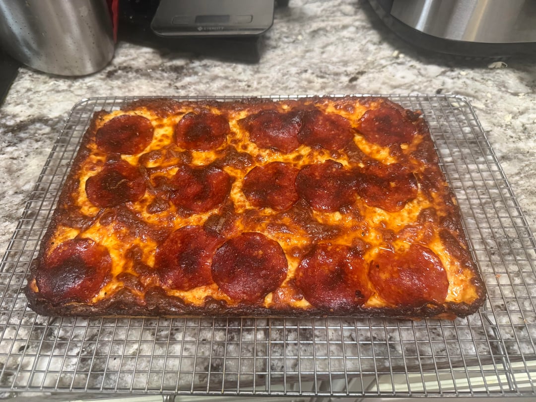 I followed the recipe that the wife of u/Muppet83 made for him the other week (I hope you’re healing well sir). I had been wanting to try a Detroit style dough before committing to a Lloyds pan and the recipe seemed simple enough. I followed Love & Lemons sauce recipe and shredded some block mozzarella. Used an aluminum brownie pan and rubbed it with shortening before putting the dough in it. Not truly a Detroit, but a tasty dabble in the style.