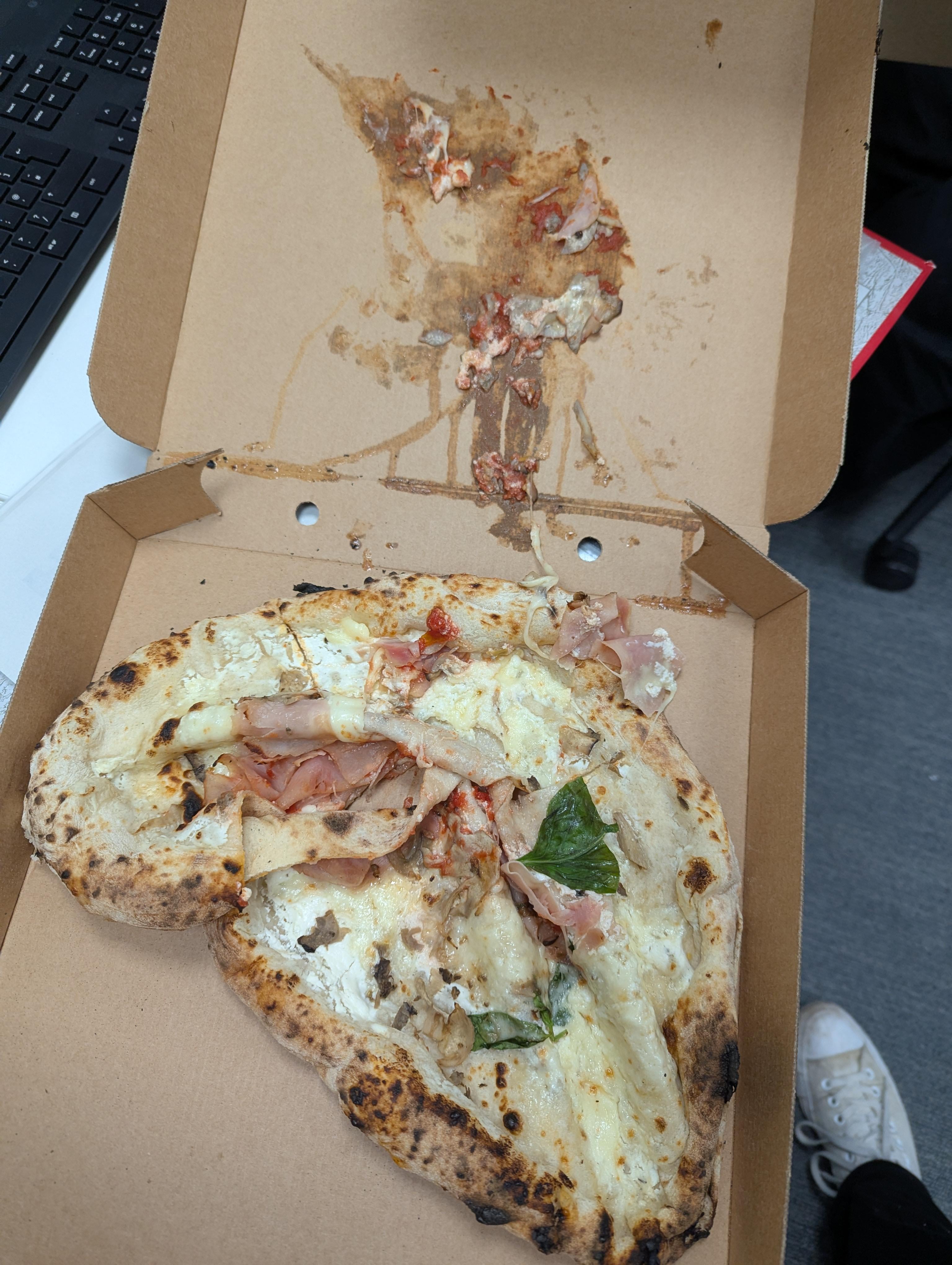 Was working late in the office so decided to order myself a pizza. I think the delivery guy must have transported it on its side but I didn't realise until I got back to my desk!