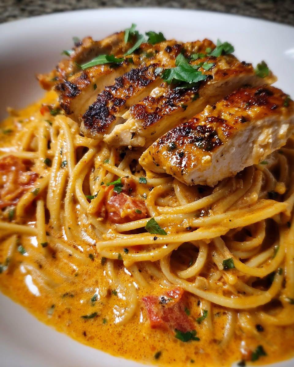 Spaghetti with Cheesy Tomato Garlic Sauce and Lemon Chicken